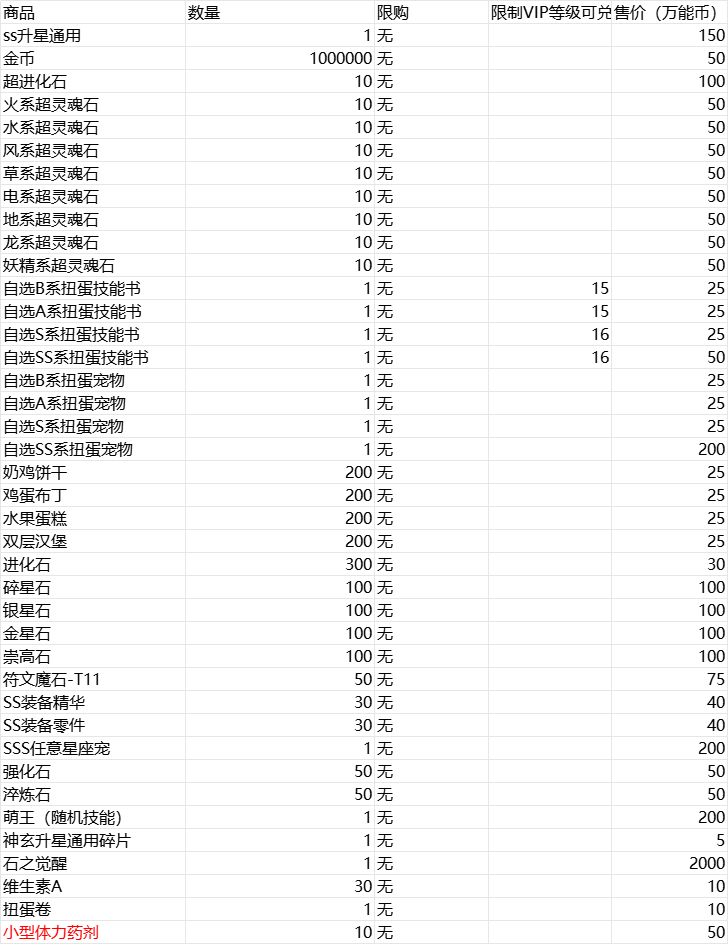 万能币可兑换商品列表,不支持拆分出售,如:经验药水100个=10个币,不支持1个币兑换10个,限购商品不支持无限兑换,每周每人支持一次,同一个号/同IP都将视为同一人