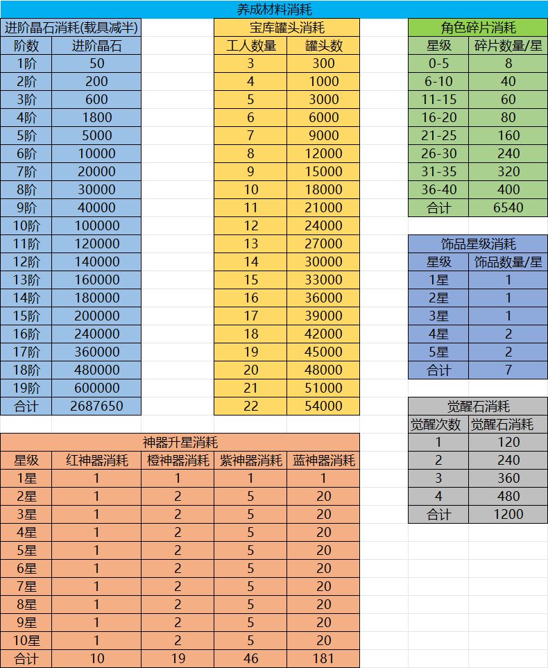 各养成系统消耗材料数据