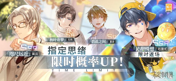 活动期间,兑换所新增莫弈SSR【咫尺远近】、陆景和SSR【沁甜绮想】、夏彦SR【碧蓝之间】、左然SR【秋叶寄梦】