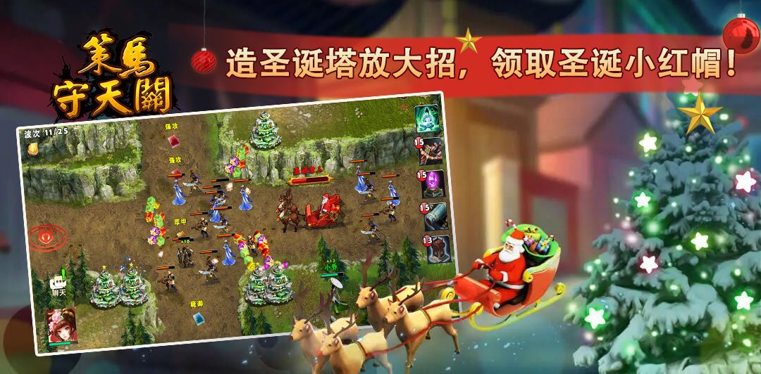活动内容:活动期间,圣诞老人驾着雪橇车会出现在娱乐专区的【群英阁】【人族无敌】关卡内,玩家可以建造圣诞树(特种塔),来攻击圣诞老人。