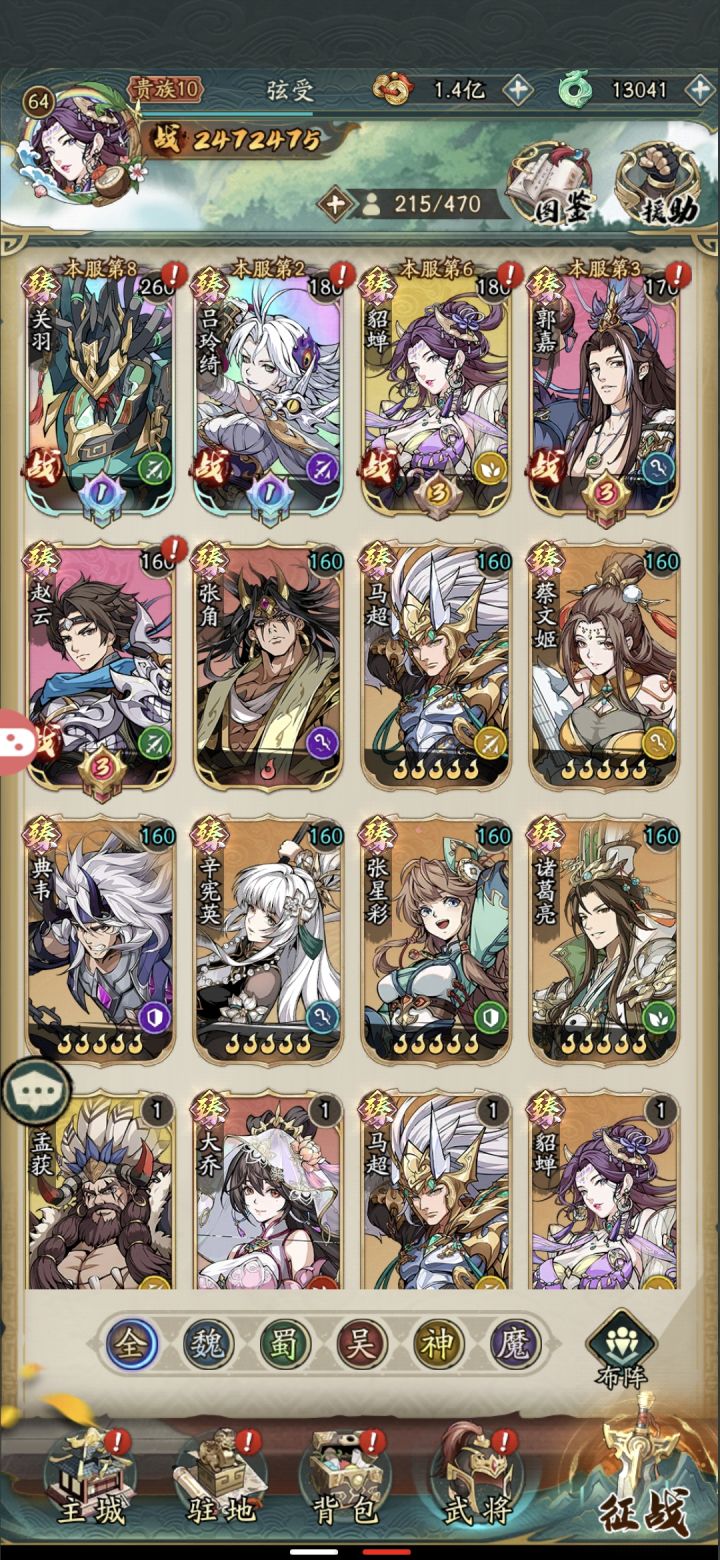大佬们,我现在不知道要不要换马超,手里有两个,珍宝可以换一个,阵营可以换一个,在攒一个上不朽3,用马超把赵云换掉,然后貂蝉等后面活动换华佗,吕玲绮换张角/典韦,你们看这样行吗?