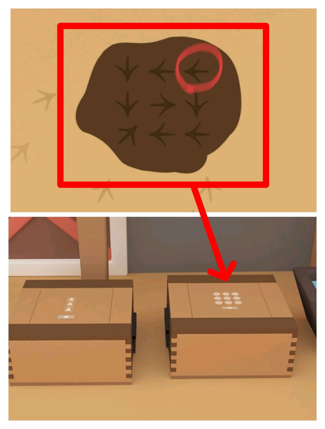 9.把子弹(第8步)交给第二个场景的农夫,他会向猴子开枪,猴子逃走留下玉米和玉米粒,再把玉米粒放入鸡旁边的空食槽,根据鸡在泥上留下的脚印可得到猪食槽旁右侧箱子的密码(圈出来的是起始点),打开箱子得到写着通缉犯信息的纸张