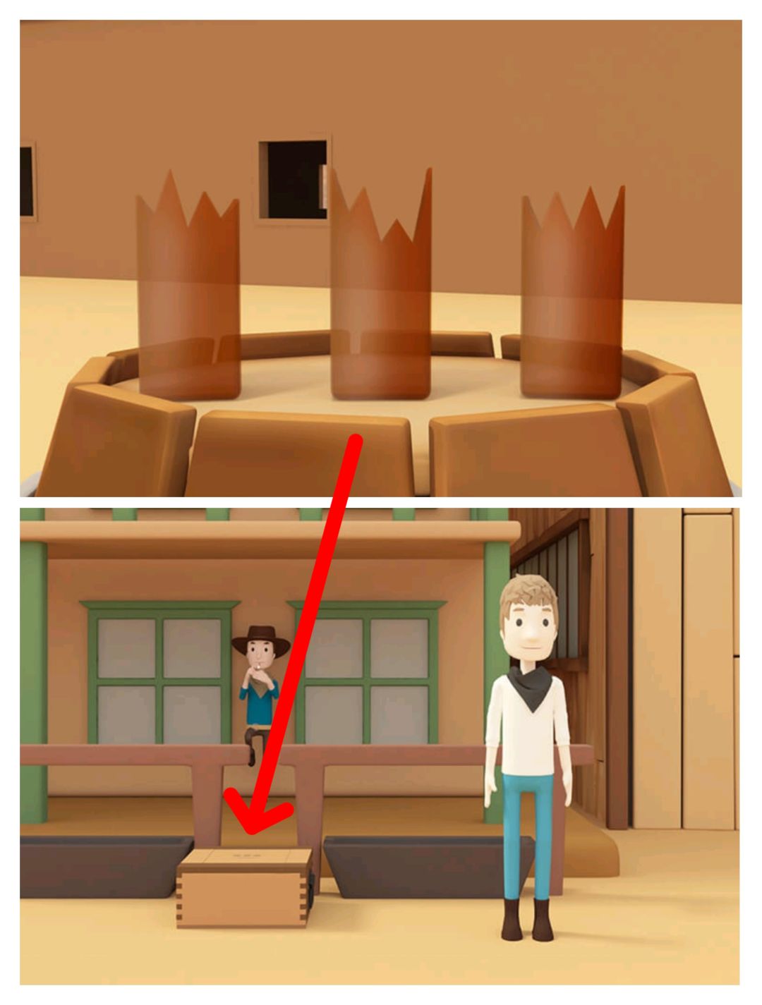 13.根据三个晕倒的人的领巾颜色和表情,可打开第三个场景仙人掌前方箱子,得到通缉令B