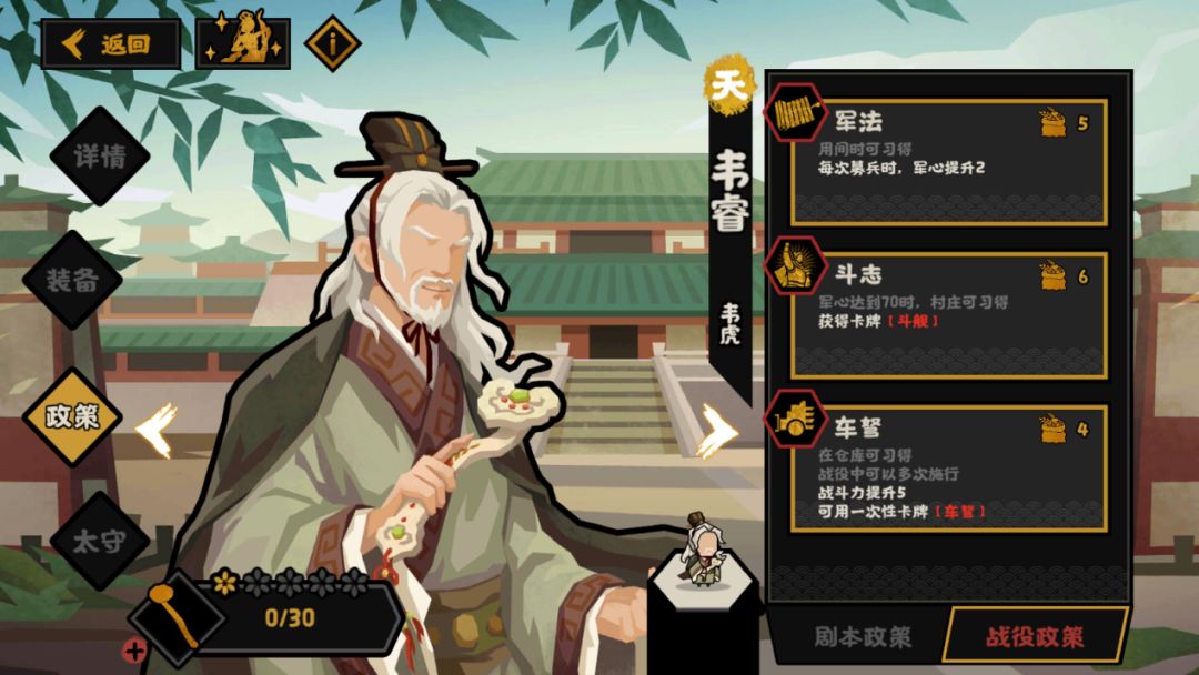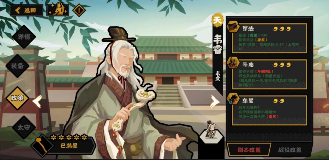 政策施行需要3个野兽/醴/士子/工匠(随朝代变化),可以获得30个【虎策】,同时获得兵法【建策】,并根据自身持有的【虎策】数量降低钱粮消耗(每有一个降低0.3%的钱粮消耗,至多降低30%)