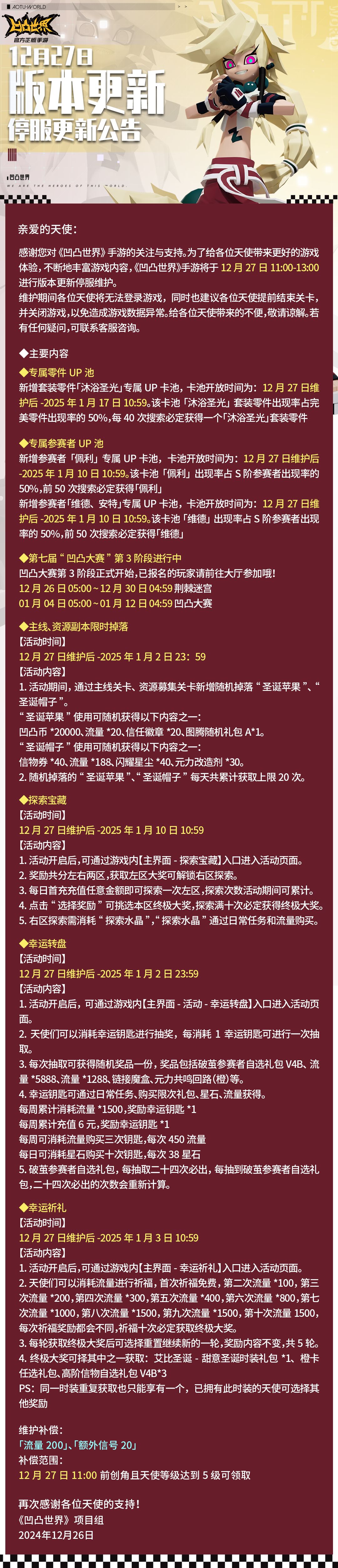 《凹凸世界》手游将于12月27日11:00-13:00进行版本更新停服维护。