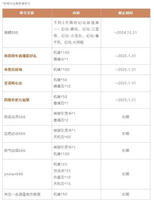 最后还有!小师妹送上近期密令合集,同样资源多多,机缘丰厚!仙友记得查漏补缺,早日兑换,我们下期再见~