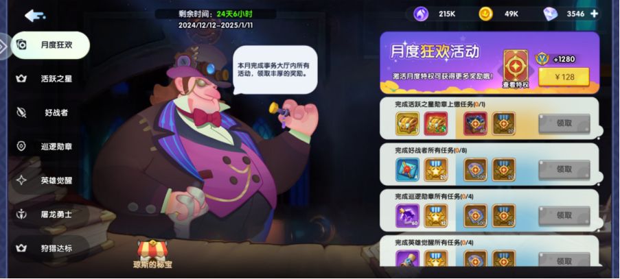这里你除了完成小任务领取奖励外,你完成一个系列全部任务也可以在月度狂欢领取一个奖励,但是这个活跃之星的必做任务你想完成的话,你不氪周卡,就只能慢慢存12个星期,等吧你就哈哈哈哈哈