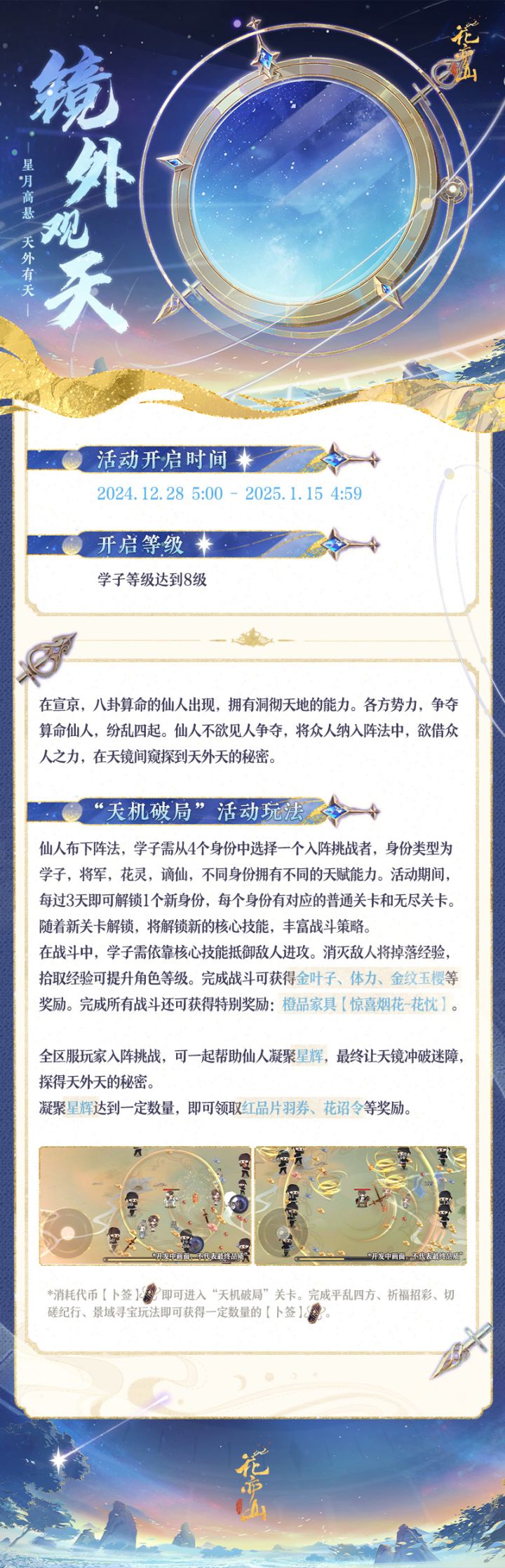 全区服玩家入阵挑战,可一起帮助仙人凝聚星辉,最终让天镜冲破迷障,探得天外天的秘密。