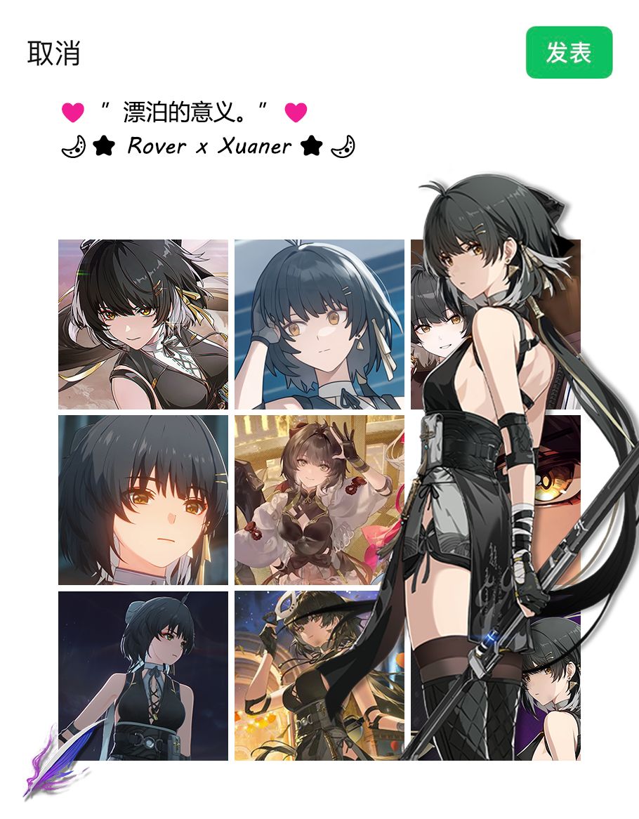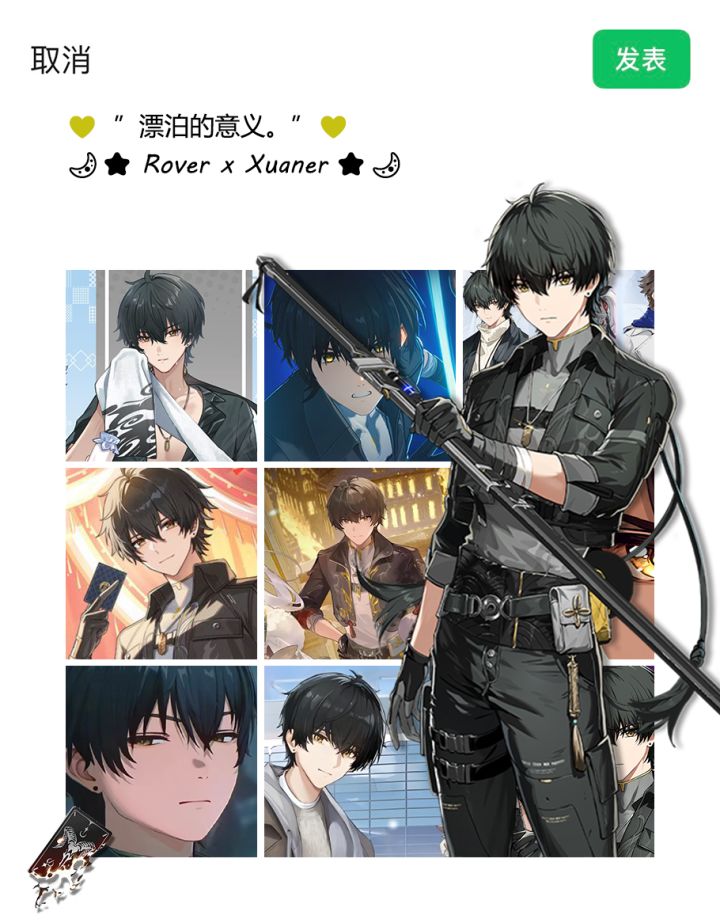 第一张是合集,第2-5张是角色单图,转载需要注明出处@轩儿 ,珂莱塔、洛可可、男漂泊者、女漂泊者都有非常多的美图,下个版本仍然会为新角色出新的版本,敬请期待鸣潮朋友圈九宫格系列第四弹~