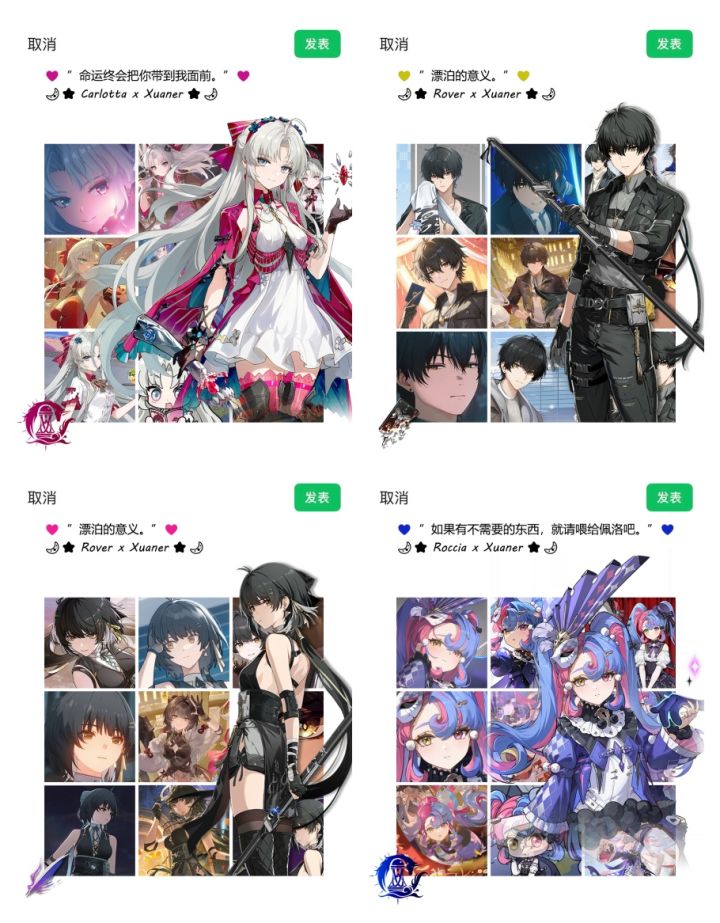 鸣潮2.0版本即将上线,轩儿这里也是赶忙奉上原创鸣潮九宫格系列第三弹~本次角色包括2.0版本新角色珂莱塔和洛可可,两位超美的女角色,以及大家呼声很高的男漂和女漂,期待鸣潮V2.0版本黎那汐塔主角漂泊着与新角色珂莱塔和洛可可的故事~