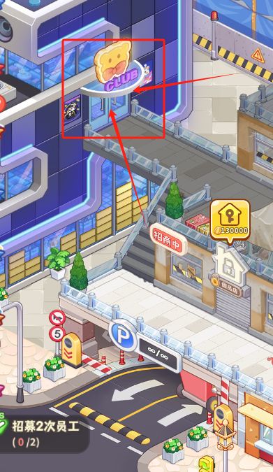 俱乐部的位置位于商业街地下停车场出入口的上方,各位店长将镜头拖动到最左边就能一下找到啦~