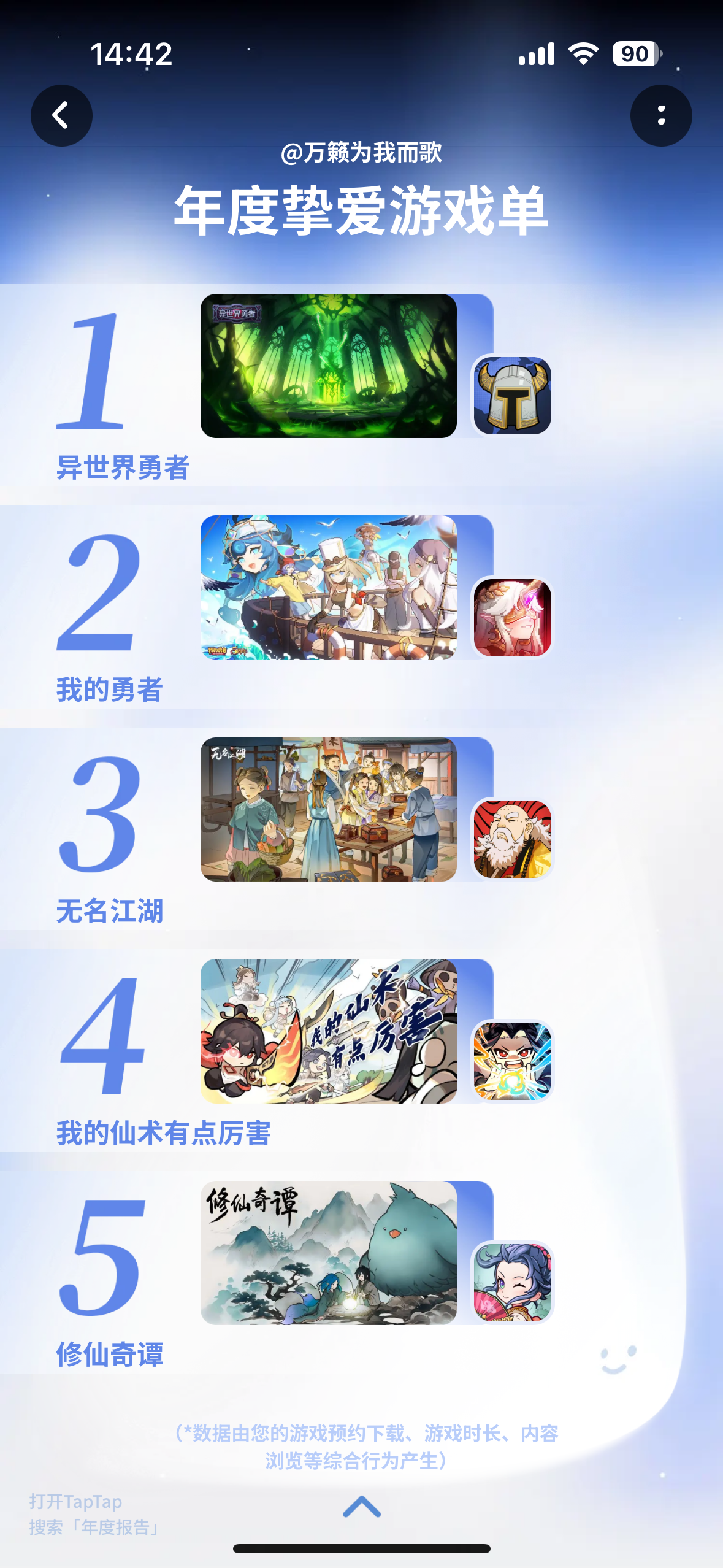 又到了一年一度各种app报告齐飞的日子了...Tap今天也上线了年度报告的活动(现在参与还有限时徽章领)我也来蹭个热度不出意料,果然是全勤了...哎等等?!怎么有360天的???不是哥们..打脸这么快?!我还在写推文...不知道勇者们的年度报告是怎么样的呢?年度游戏是勇者还是其他的游戏呢?欢迎在评论区分享你的年度报告截图!我们会在1月1日16:00抽取20位勇者送出魔女盲盒一份