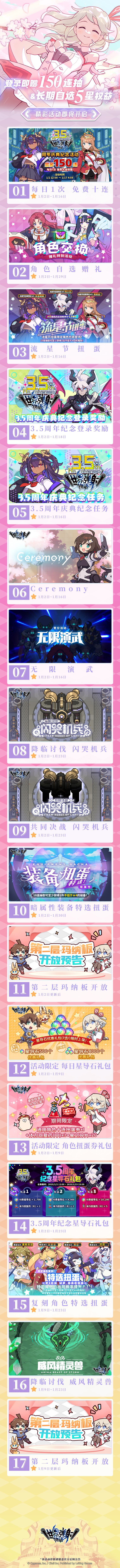 我们为各位冒险者整理了3.5周年庆典版本的活动情报。登录即赠免费150连抽&长期自选★5角色权益!