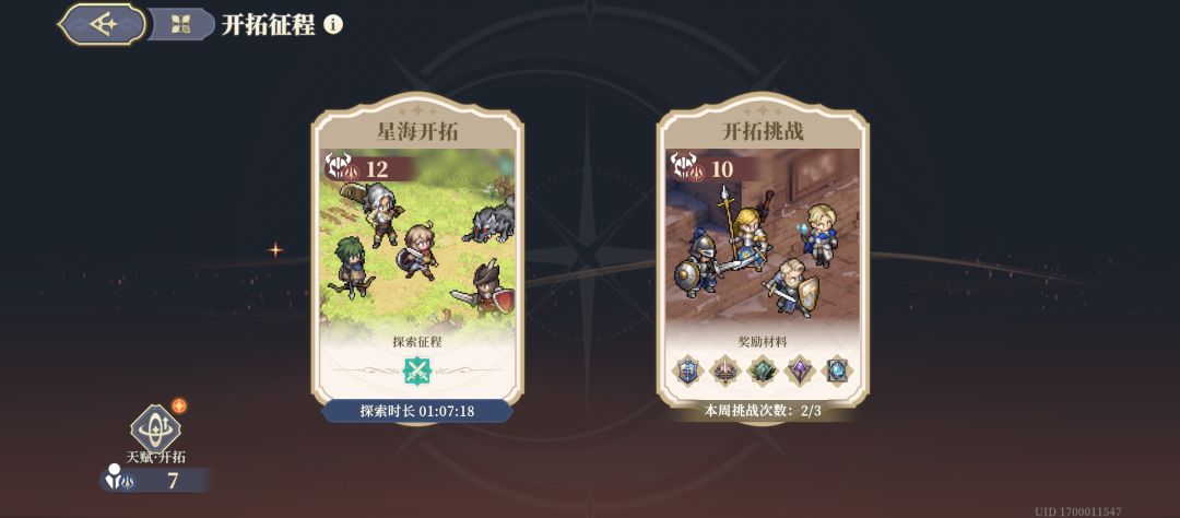 【开拓挑战】类似进阶试炼,敌人阵容固定,由易到难分了12层。并且引入新的等级制度_“开拓意志”,意志高于关卡时削弱敌人,低于关卡时增强敌人。