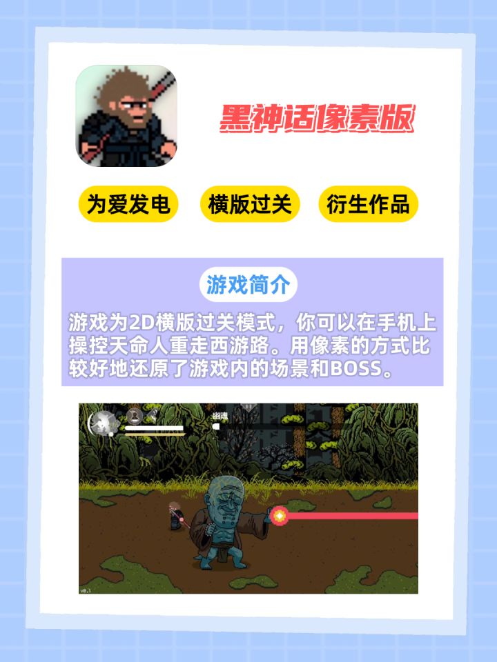 游戏为2D横版👉过关模式,你可以在手机📱上操控天命人🦸♂️重走西游路🐉。用像素🎨的方式比较好地还原🎨了游戏内的场景🏰和BOSS🐲。