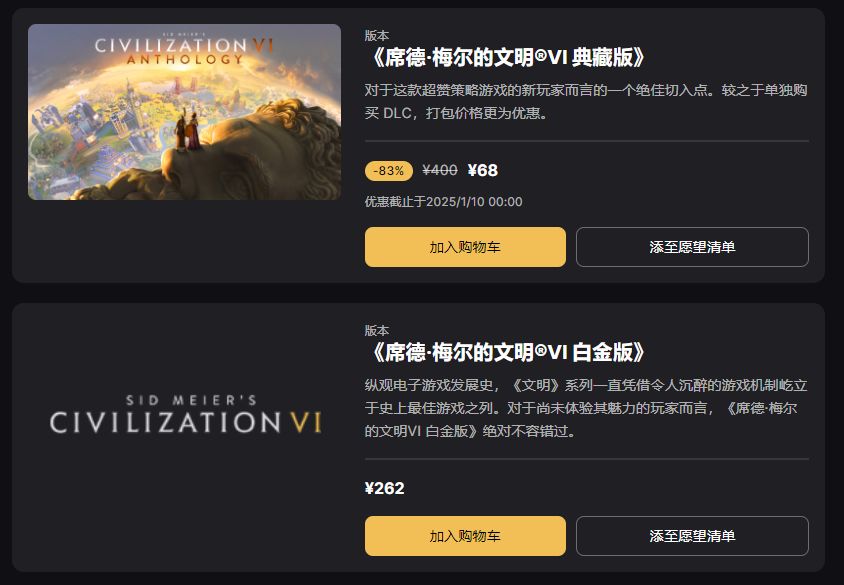 EPIC商城在本次的促销中,《文明6》的全DLC版本进行了折扣,而“白金版”反而没有进行折扣,这就是E父不想让你买这个版本,免得“背刺”啊。