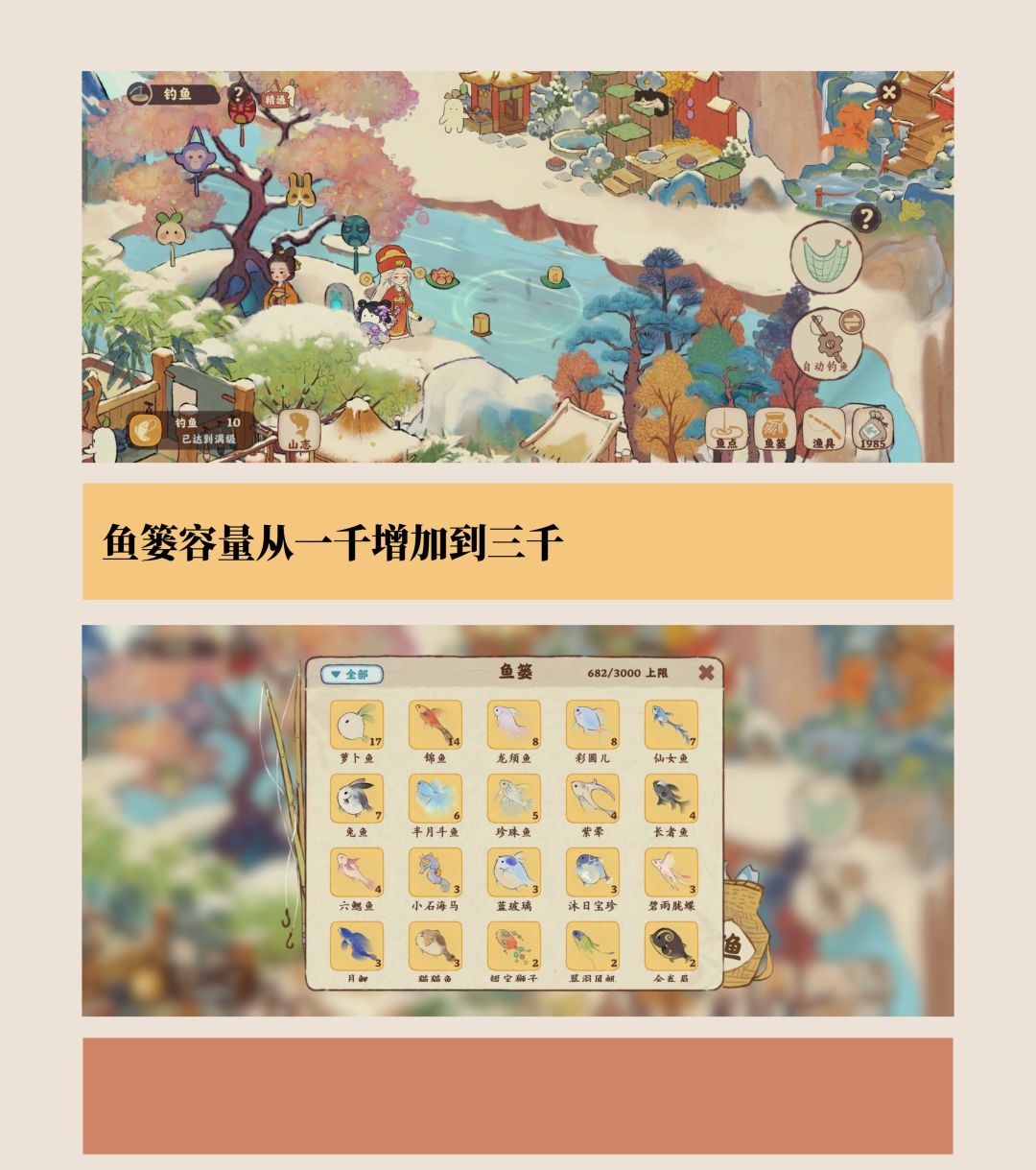 3.鱼池鱼篓的容量上限从1000增加至3000