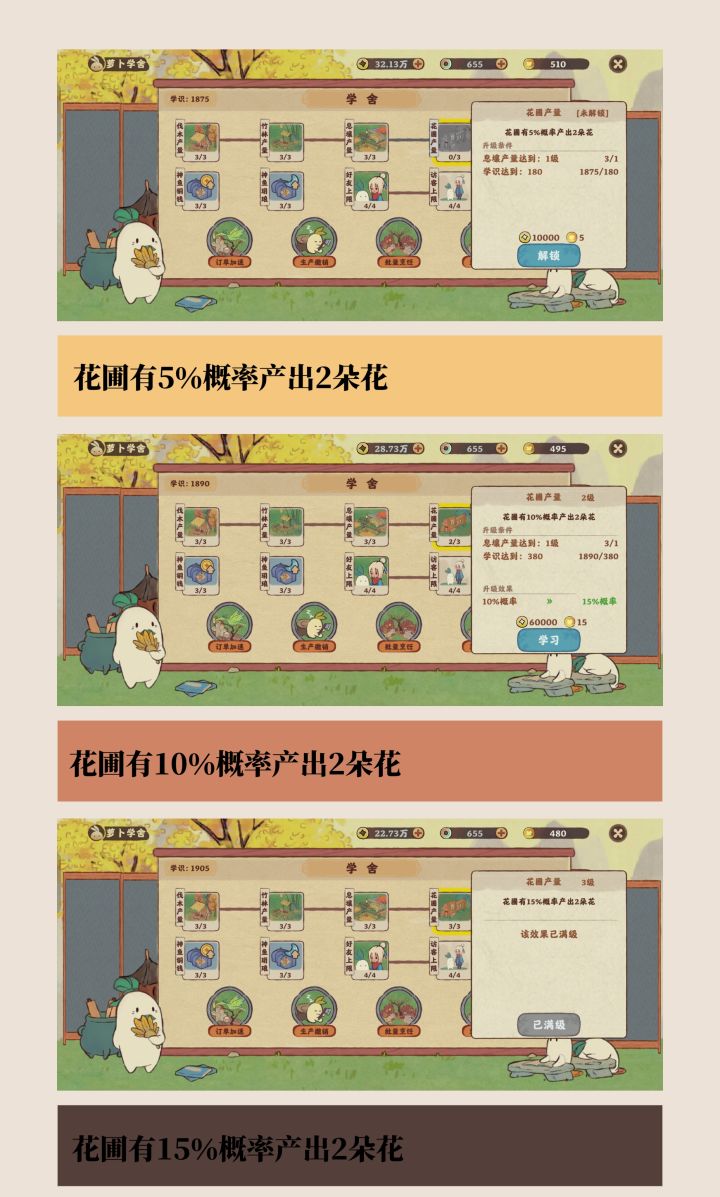2.萝卜学舍新增天赋「花圃产量」,点完三次后产出两朵花的概率提高到15%