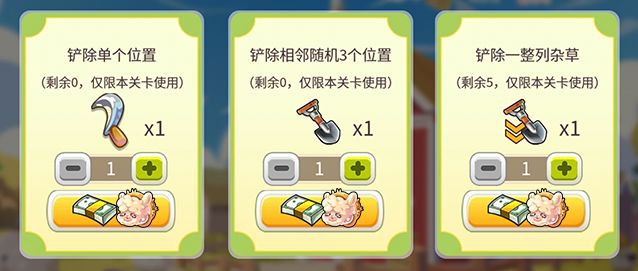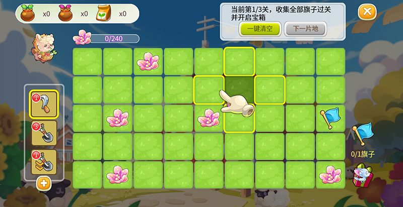 进入草场。使用工具点击草地开始除草。除草过程中可以收集花花(进度)、种子、肥料。