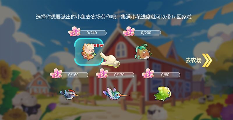 点击选择想要派出的小鱼开始劳作,集满进度可以带ta回家。这次我们来选上可爱的绵绵仔!