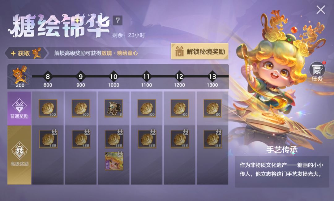 提升等级可免费获取童梦头像框自选箱、英雄碎片等奖励;付费30元可得新款史诗皮肤敖璃·糖绘童心、我只是个宝宝表情;付费128元可额外获得以下传说限定皮肤二选一:曹操·光明之翼、伏羲·光影圣灵