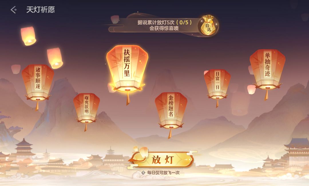 每日放灯,可获得热诚之馨,精致手信礼包等奖励;累计放灯5次,可以获得以下头像框二选一:翰林清韵头像框、空山琴语头像框
