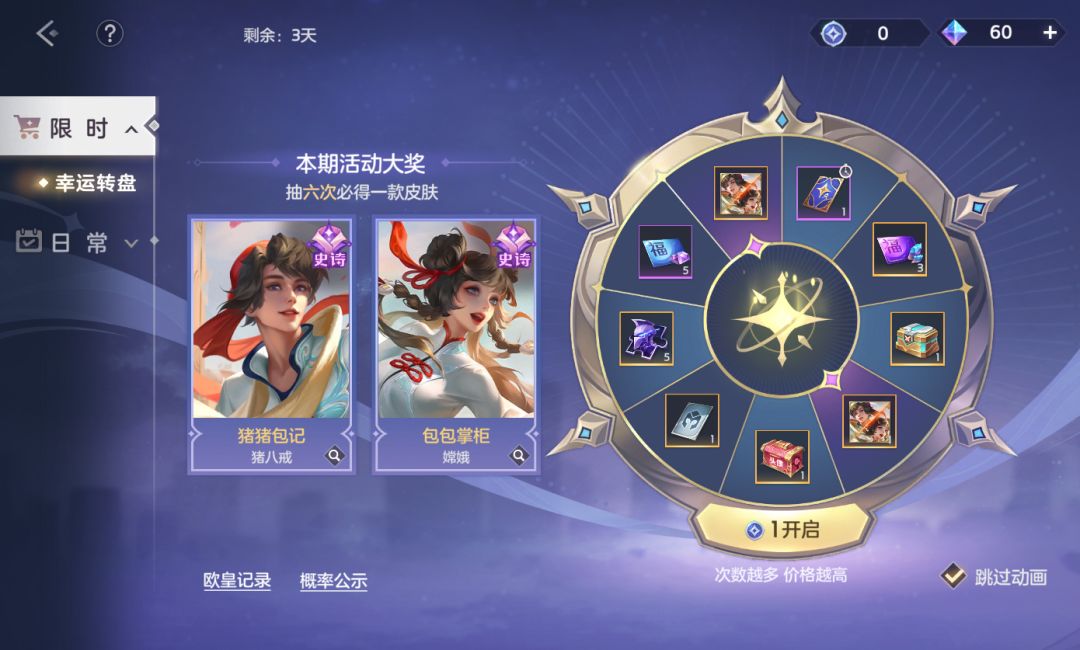 使用龙晶购买获得幸运币,进行抽奖。猪八戒·猪猪包记、嫦娥·包包掌柜、幸运星击败自选箱、幸运星头像自选箱、龙魂祈福卡、皮肤碎片、排位加星卡等奖励等你来抽!最多6抽获得一款皮肤,最多9抽可获得全部奖励,前3抽抽到皮肤的守护者会获得欧皇称号