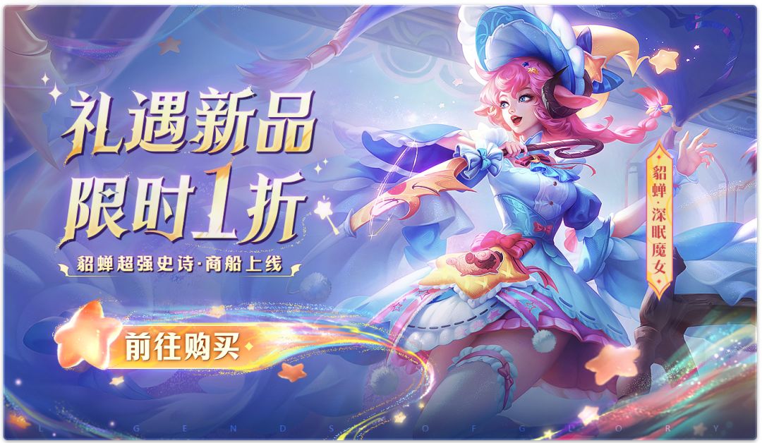 貂蝉·深眠魔女皮肤礼包1折直购开启!购买新款礼遇皮肤,即可获得貂蝉·深眠魔女、橙心钻*10、金币*2888