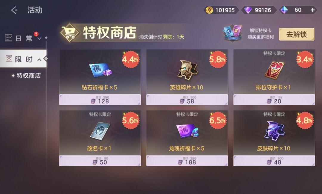 解锁特权卡,享受超值折扣,使用礼券购买龙魂祈福卡、皮肤碎片、排位守护卡、改名卡、英雄碎片等多种福利