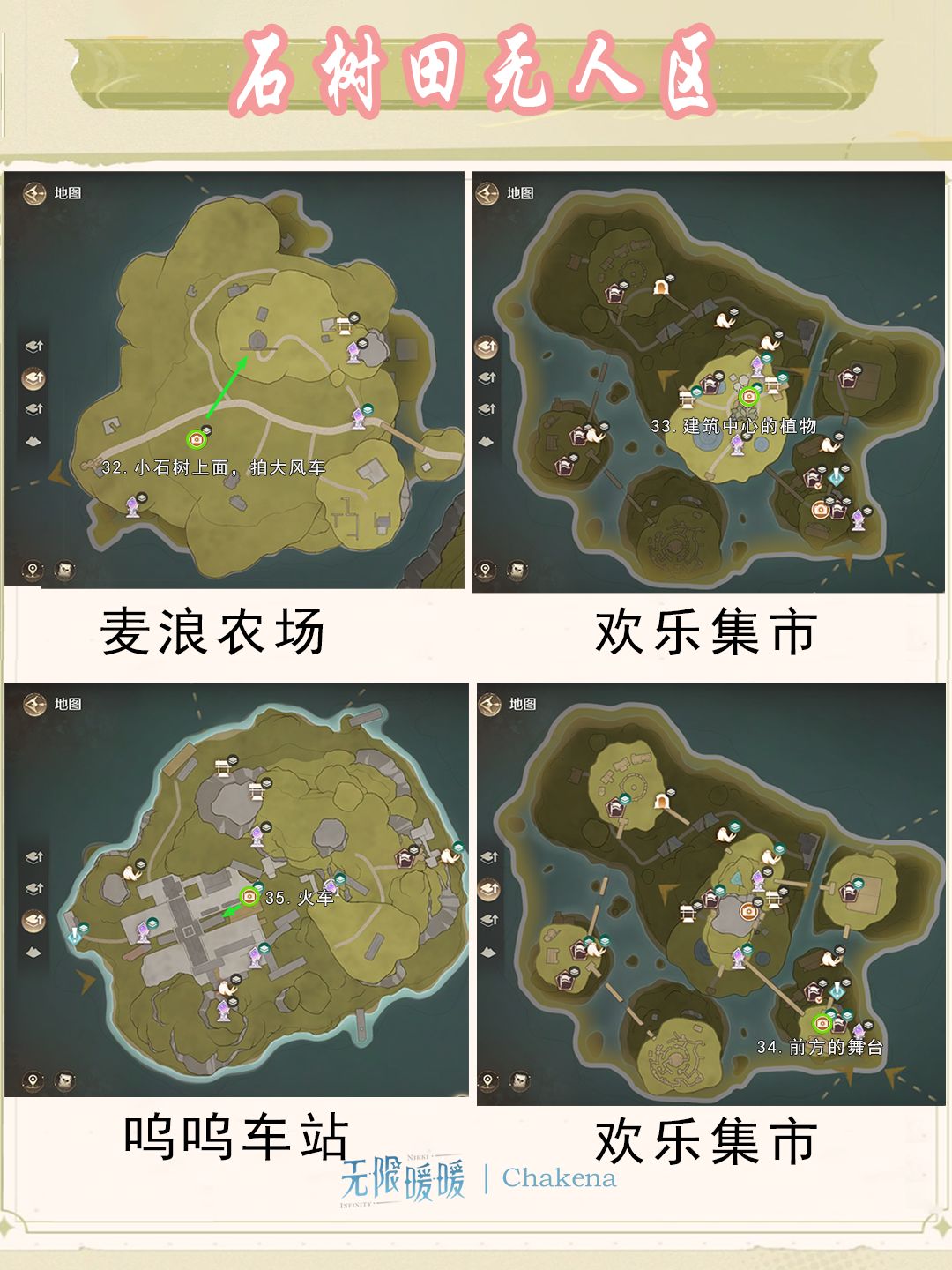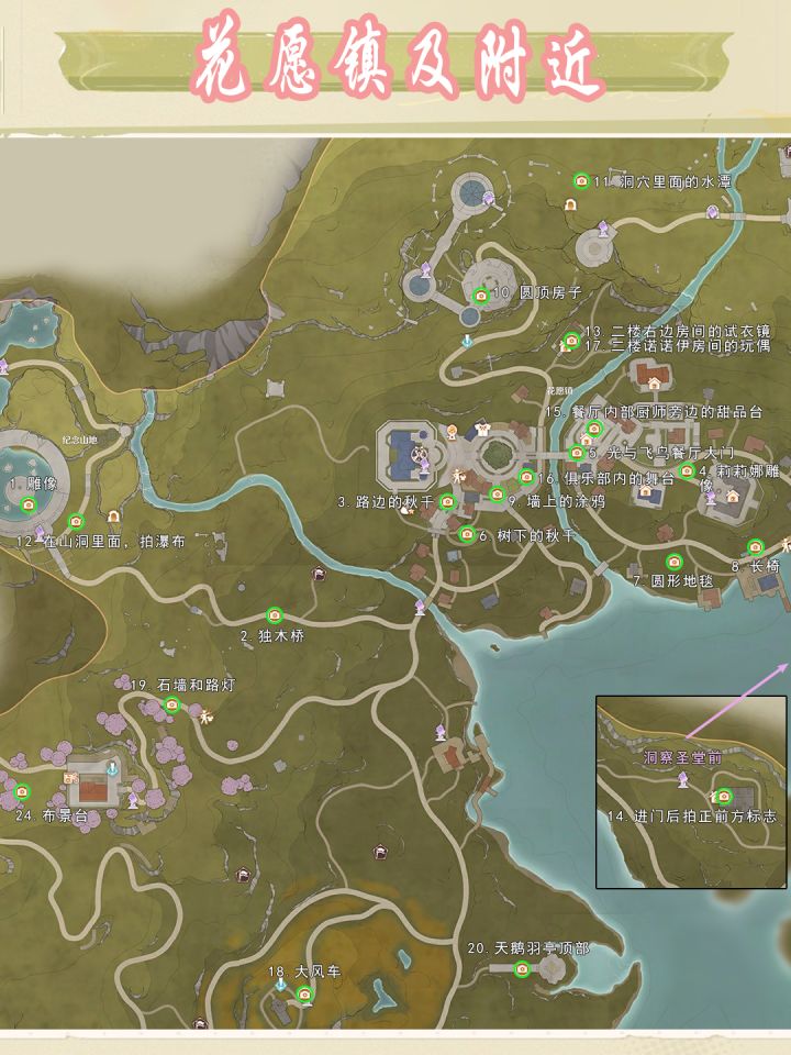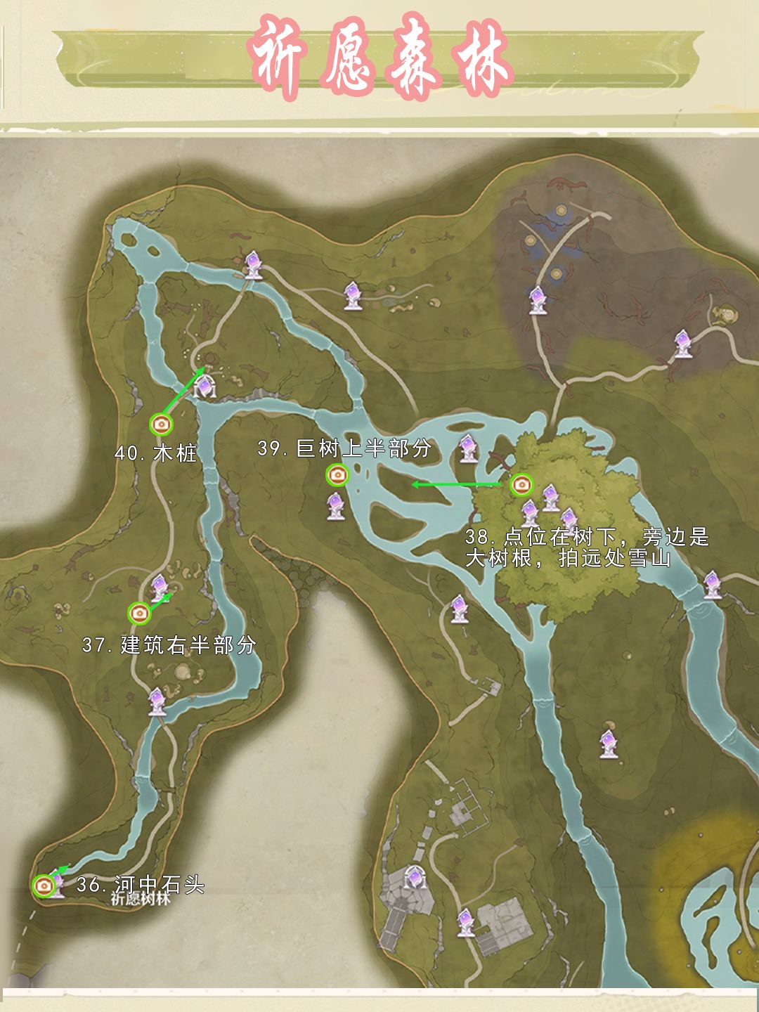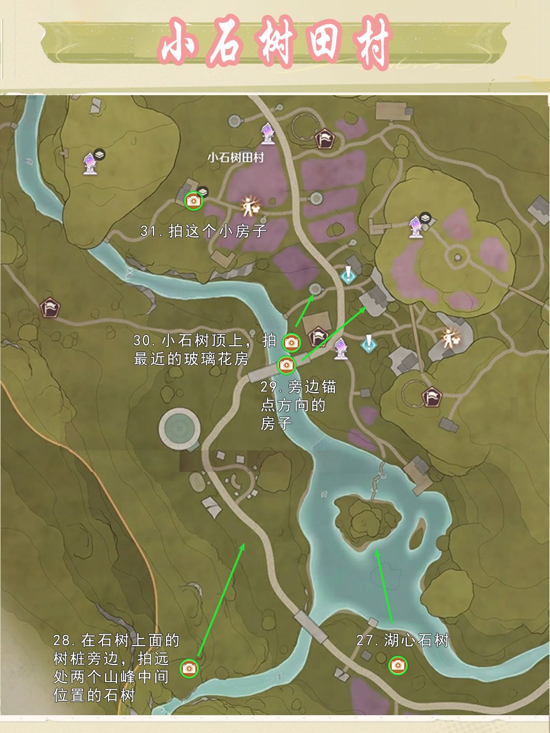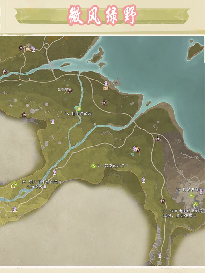攻略中的序号代表该点位在打卡册中的序号,文字代表打卡需要拍摄的参照物,绿色箭头代表拍照方向参考。