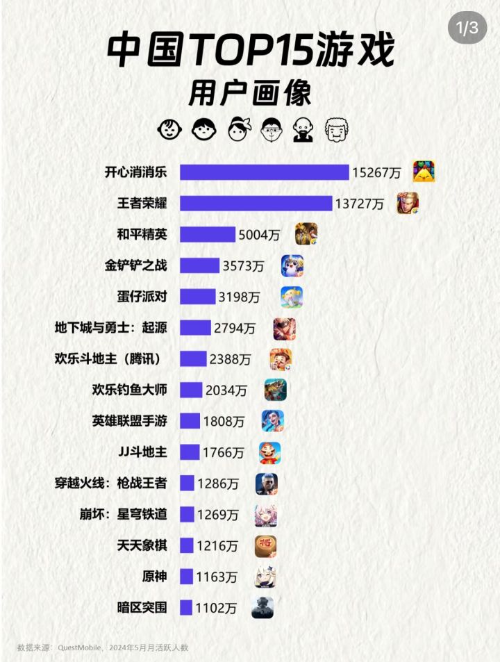 1️⃣中国前15大游戏中,开心消消乐以1.53亿月活跃用户数居首,其次是王者荣耀(1.37亿),和平精英(5004万)和金铲铲之战(3573万)。其他游戏如蛋仔派对、地下城与勇士:起源和欢乐斗地主等紧随其后。