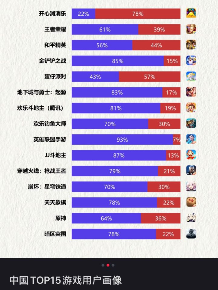 2️⃣用户性别构成方面,开心消消乐和蛋仔派对吸引了更多女性用户;其余游戏男性用户占比均较高,其中英雄联盟手游男性用户占比高达93%。