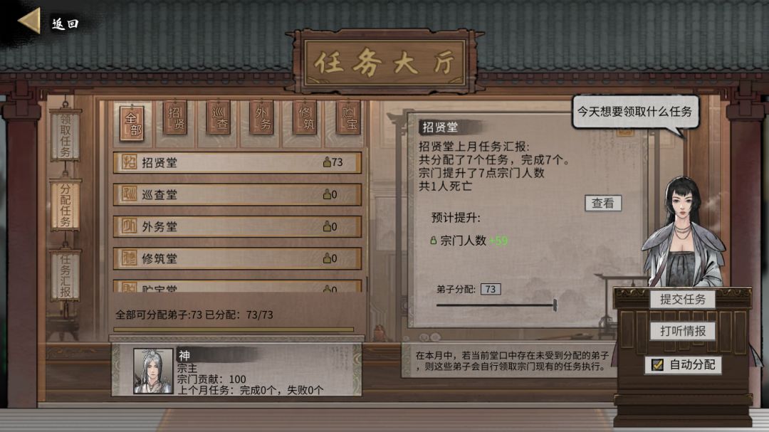 然后点击任务大厅,分配任务一栏把所有弟子调去招贤堂