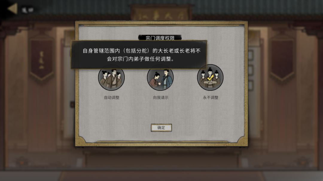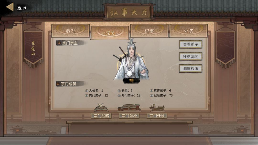 拍卖完之后回门派准备进攻其他门派,在此之前先把门派调整一下,点击议事大厅,然后点击调度权限