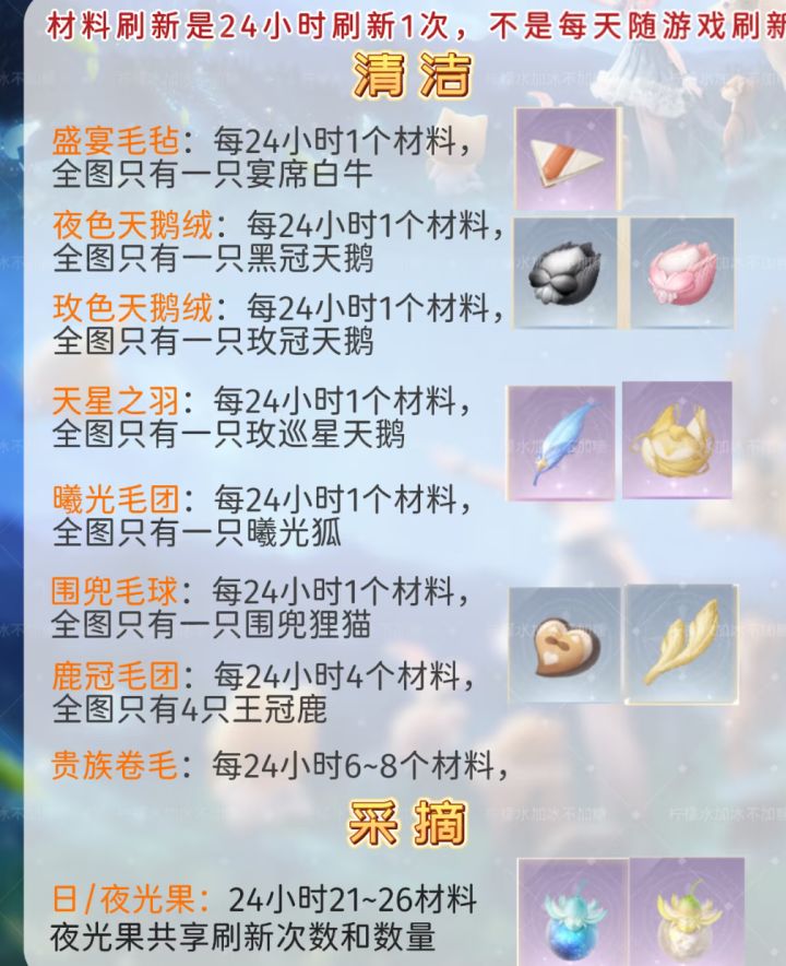 所有的材料刷新时间都是24h,只不过高级的本体少,低级的本体多,所以本体多的暂不做统计