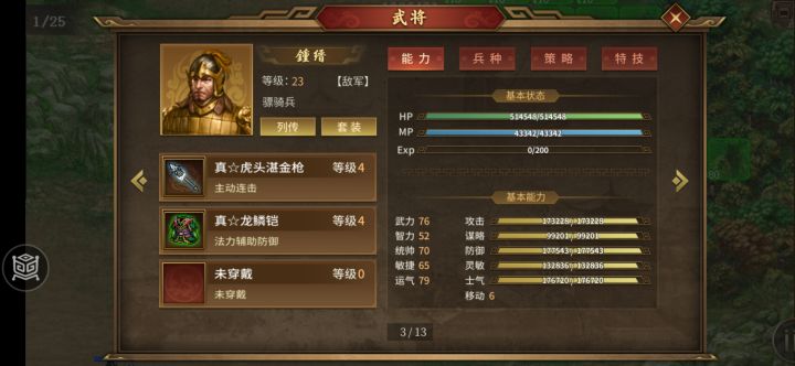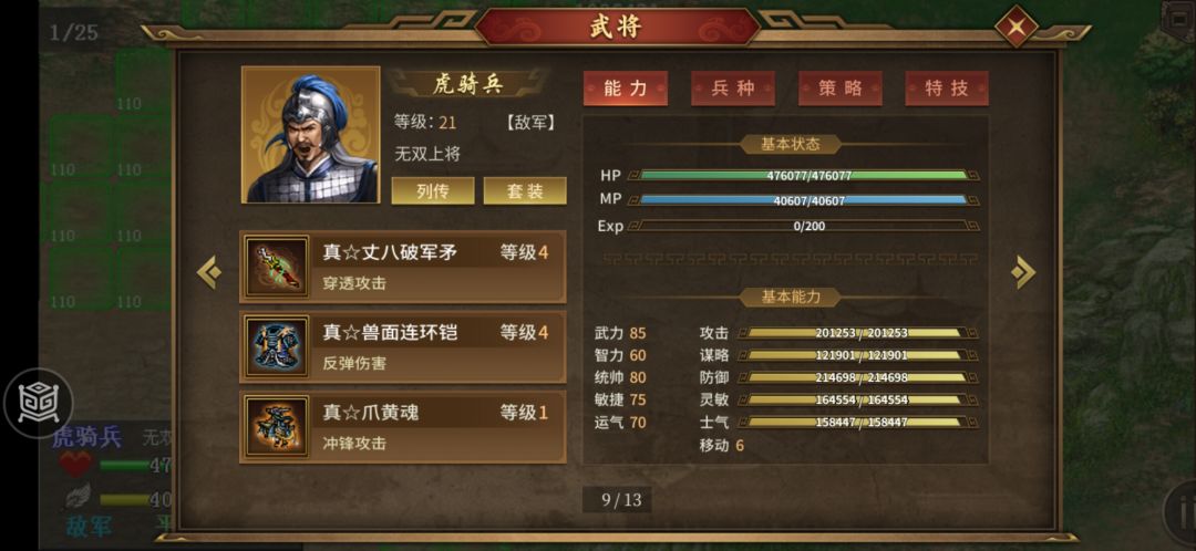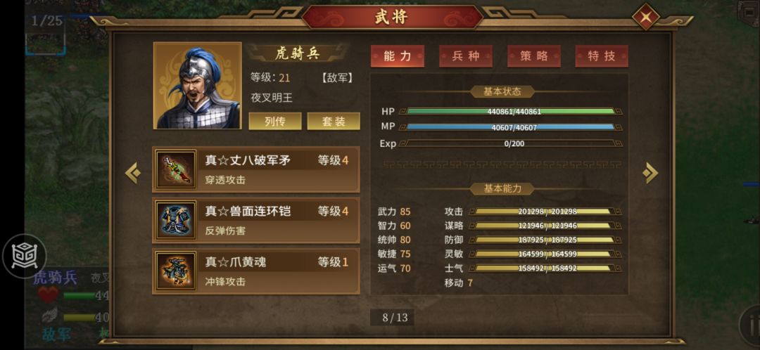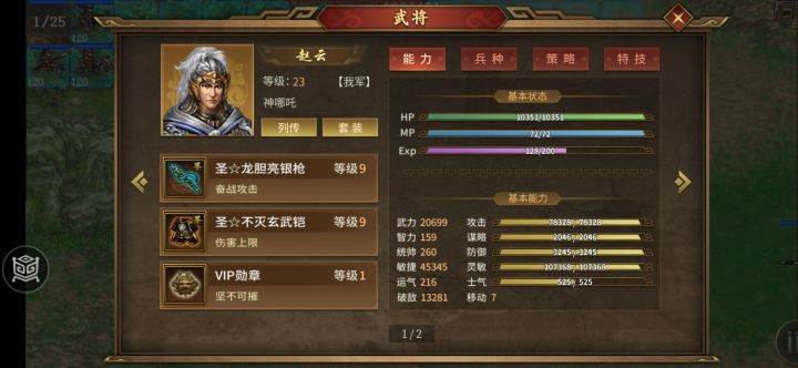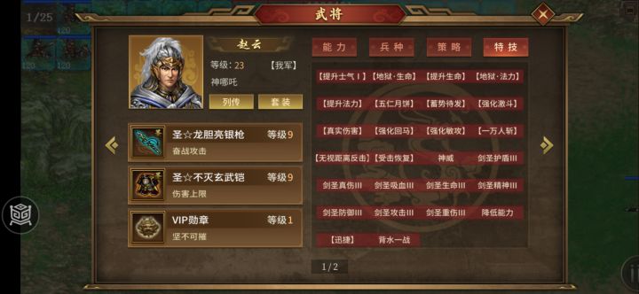 最难的单人关,赵云神灵童穿杨拓皮,吃了1万攻击果,技能主要吃了蓄势待发,进场攻击力8万,过关时攻击12万,因为攻击力不够,这关摸索了很久,那个虎骑兵的反伤特麻烦,夜明叉王还可以用技能慢慢磨死,无双上将直接攻击和技能攻击都被立马反死,只能多存档慢慢打。前5回合打死左上4个敌军和右上1个弓兵,留下钟缙钟𬬹和1个虎骑兵,后面的回合下去杀掉中间的敌军,慢慢磨下面两个虎骑的血,最后一回合5个一起送走。