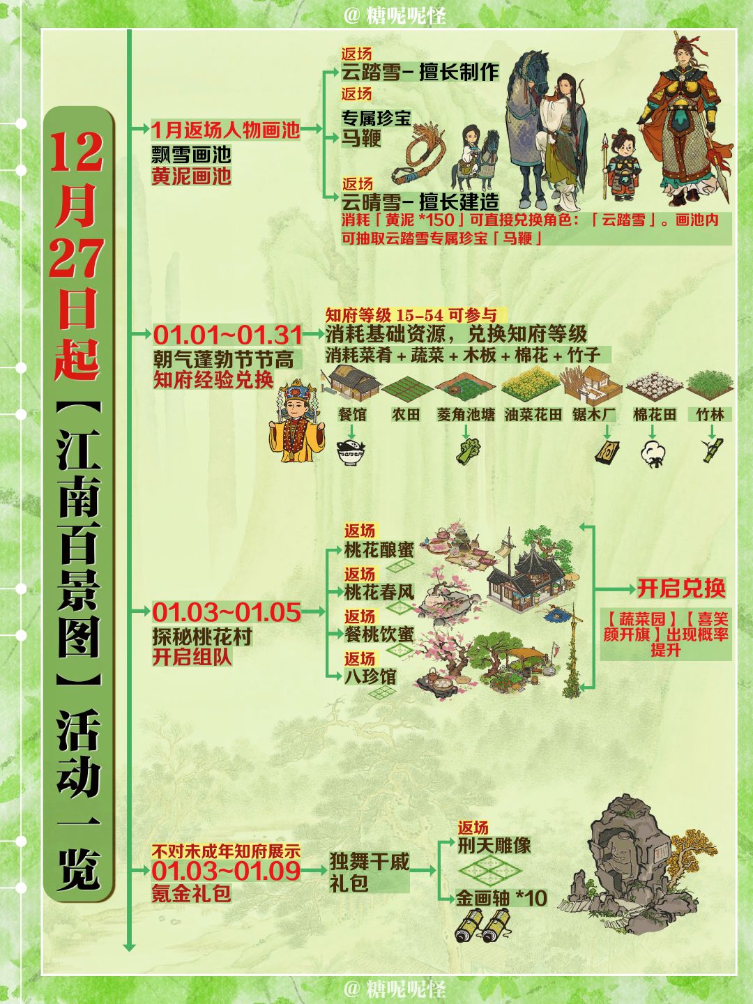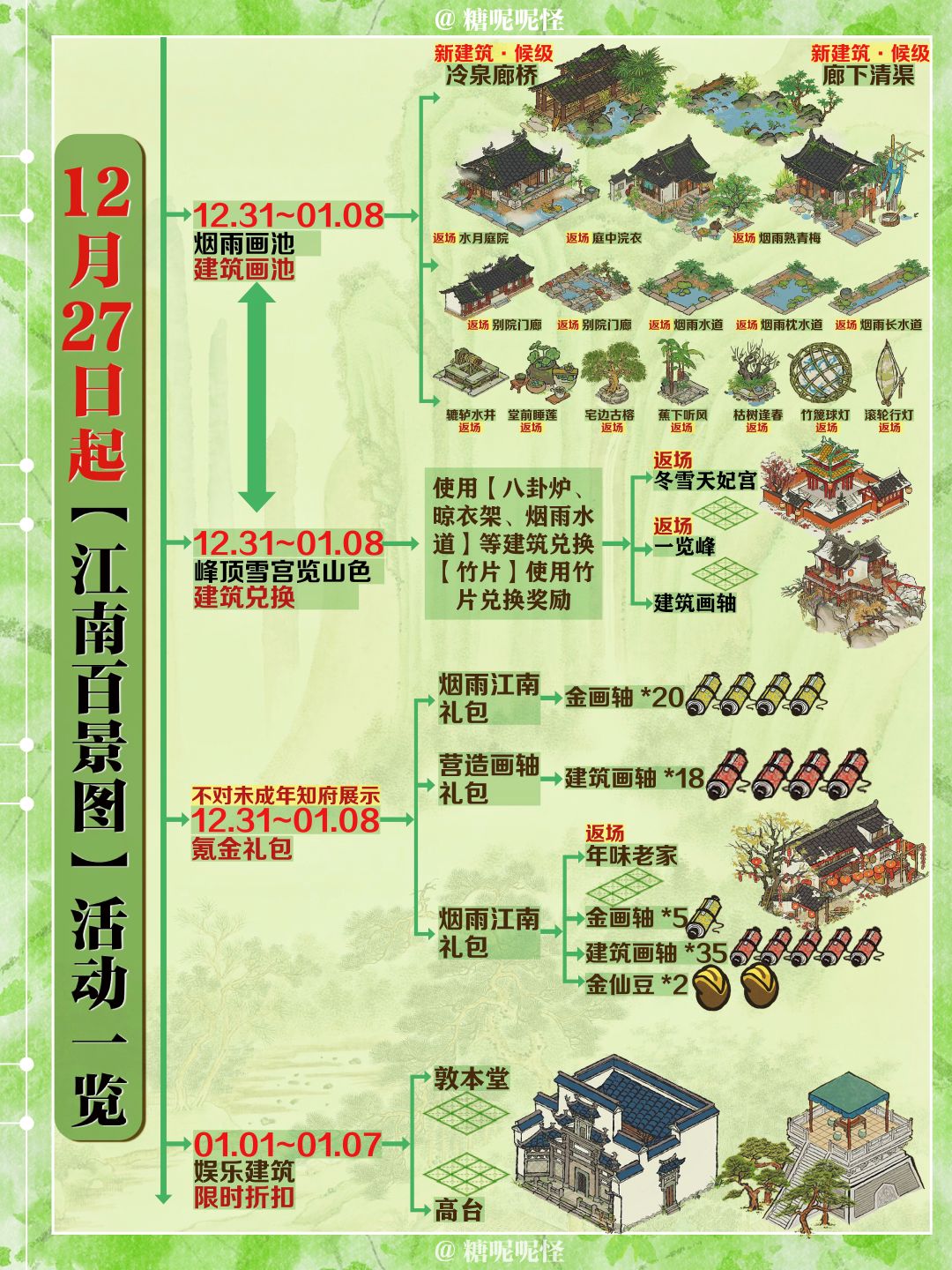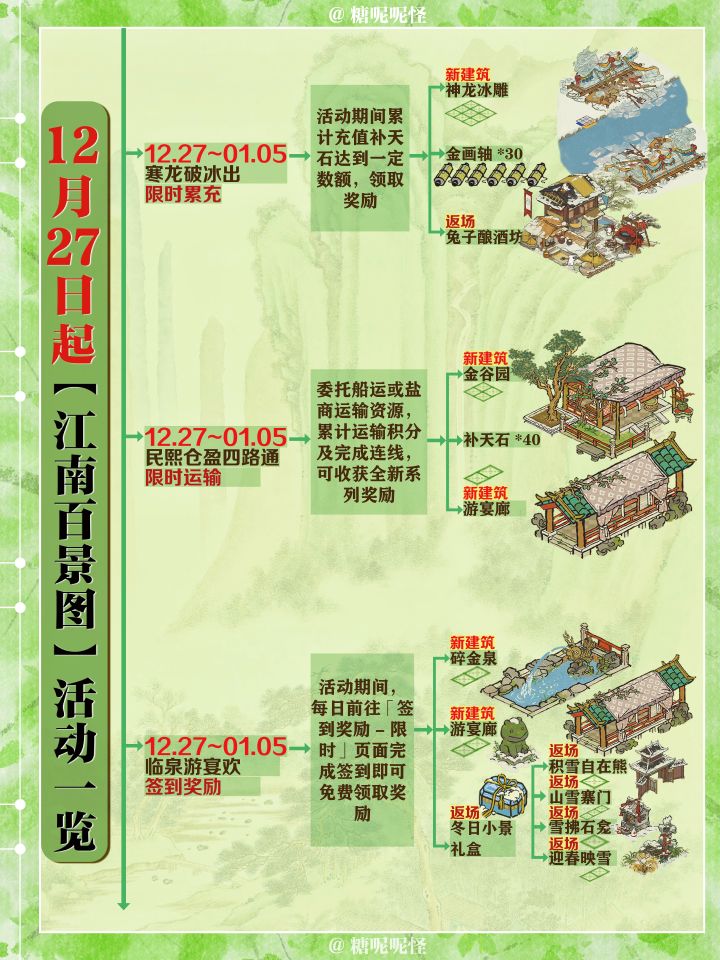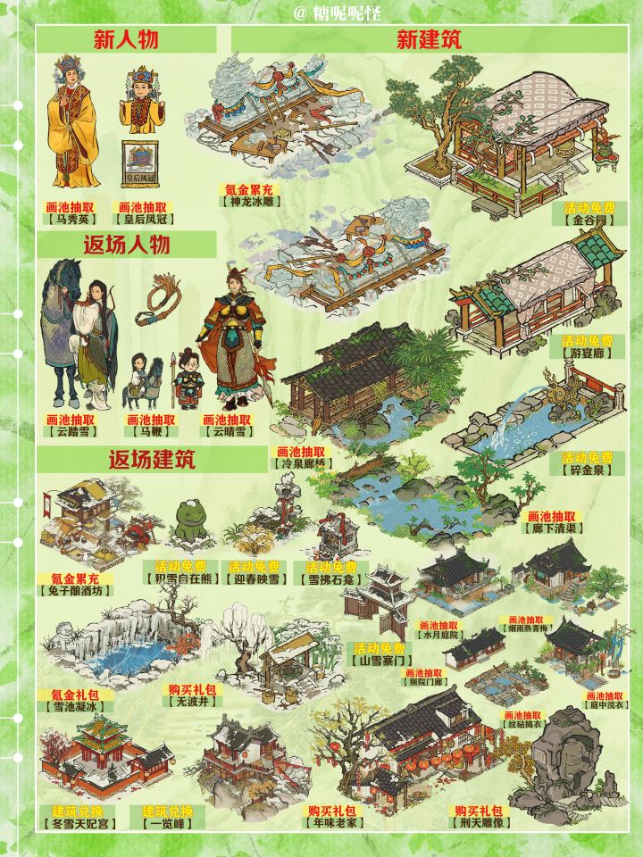 4️⃣返场建筑:烟雨画池返场|兔子酿酒坊|雪池凝冰|无波井|冬雪天妃宫|一览峰|年味老家|刑天雕像|