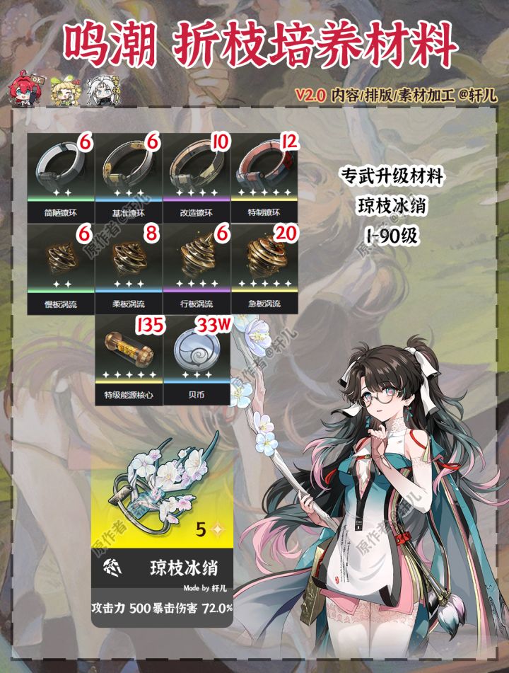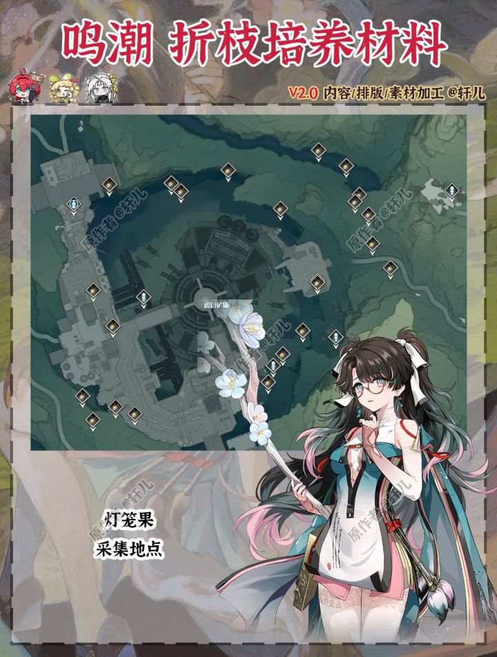 折枝即将在V2.0上半1月2日复刻,如果在1.2后入坑想要补票折枝的玩家可以按照图中材料提前准备起来了,包括折枝升级材料、折枝材料、折枝霖技能升级材料、折枝专武琼枝冰绡材料、突破材料云灯笼果采集路线~