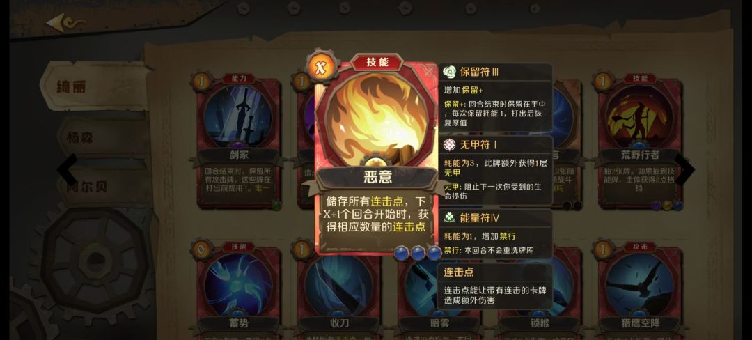 恶意此卡存在bug。此卡实际上根据情况打能量符或者磐石符等让能量x固定数值最好用。原因是此卡使用后直到给的恶意buff消失前再次使用恶意会导致新一次使用的恶意存储连击点无法覆盖旧一次的连击点。只能等上一次连击点buff消失后再次使用才可以更新存储连击点。由于恶意buff是回合开始时消失,并且还会提供旧的一次恶意的连击点,此回合再次使用恶意即可更新连击点的数量且会包含上一次使用恶意存储连击点数量,达到无穷无尽叠加连击点的效果。