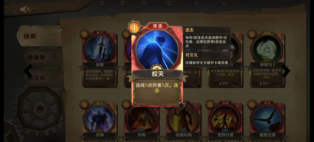 然后牌组构成除了格挡牌,剩下的牌就是和连击点相关卡或者增伤卡。其中负责提供连击点的普攻或者猎鹰空降一般情况下三到四张(多了卡手,少了没伤害),收刀和淬炼一村看情况拿(可能卡手),二三村成型后可拿。收割时间是此卡组最核心增伤配件。但是此卡出现率一般,但是没有此卡依然能通关。