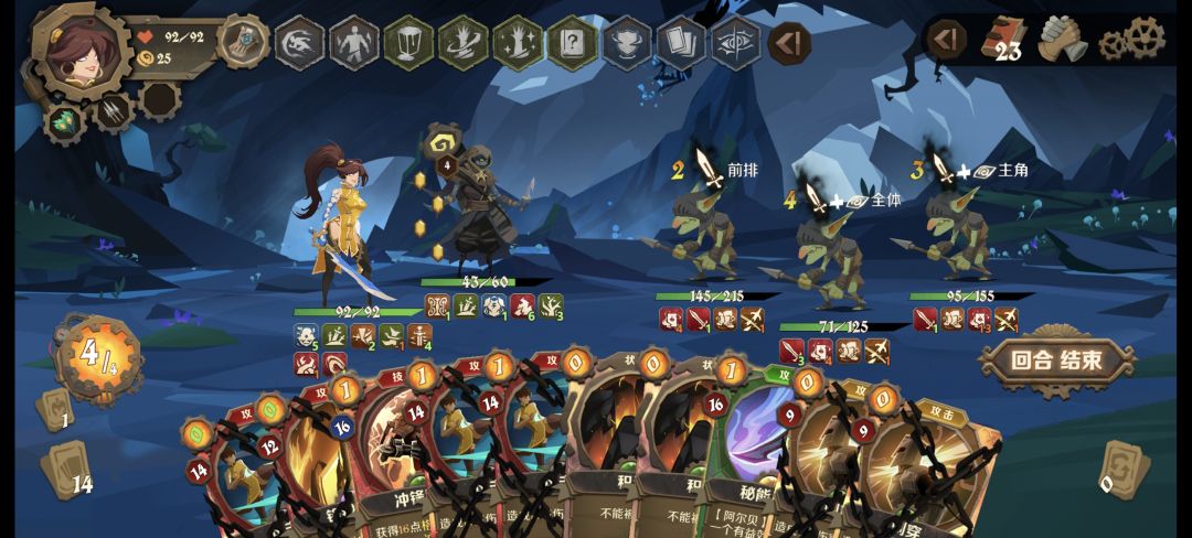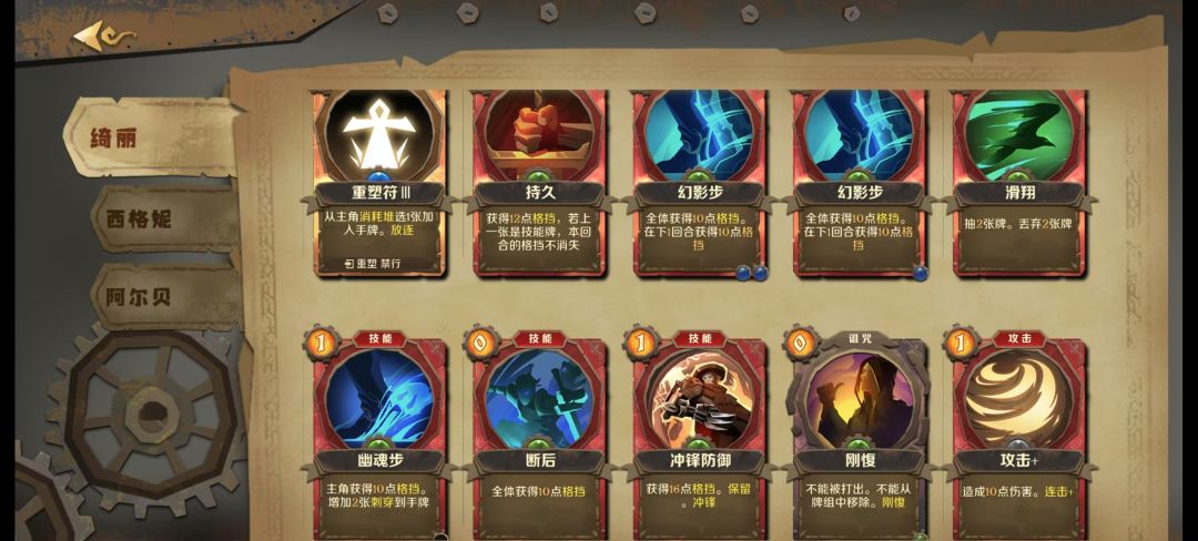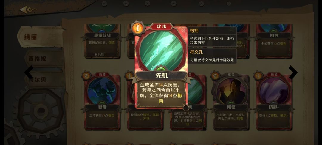 回到原来话题。所以剑冢背刺流就是鬼影身法+剑冢,抓到背刺前输出可以依靠幽灵步甚至普攻进行过度。既然是长回合战斗,那就要不断进行防守格挡怪物攻击,所以此打法需要大量上手格挡牌。我个人认为格挡牌和其他牌比例大概接近1比1(格挡牌少点)即可打的很轻松。剑冢绮丽的危险回合是第一回合,上手格挡牌都会降低战损(这真的很关键!)。