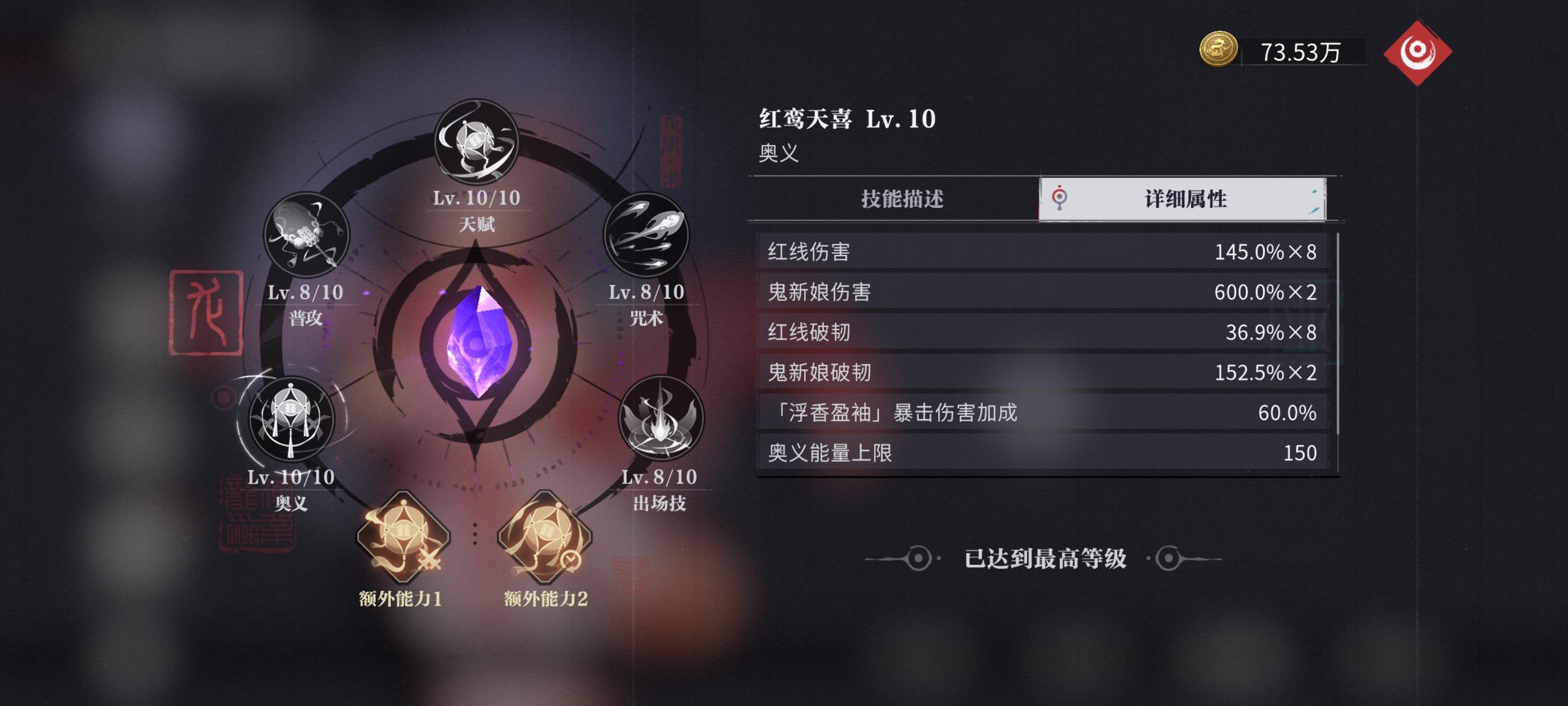辅助能力:咒术提供了30%的攻击力(需要朱砂4290攻击力),大招提供60%的暴击伤害,辅助攻击,持续回血。1命增加一次咒术次数,2命减少阴抗,好像没啥必要补命座
