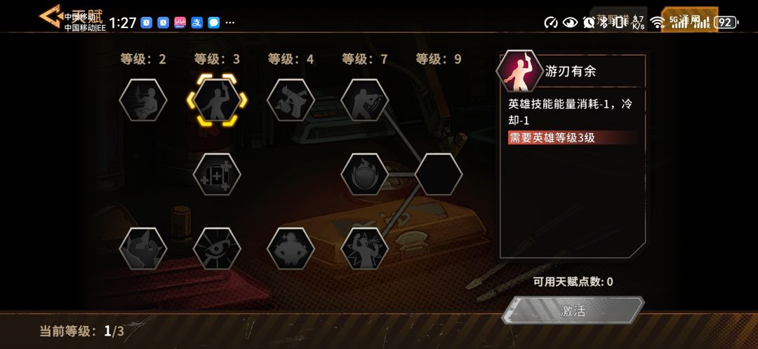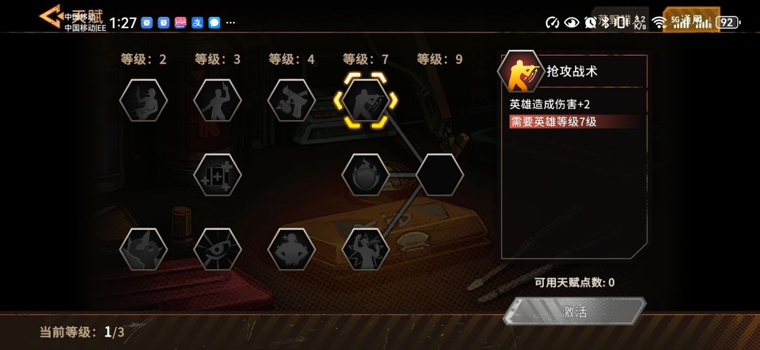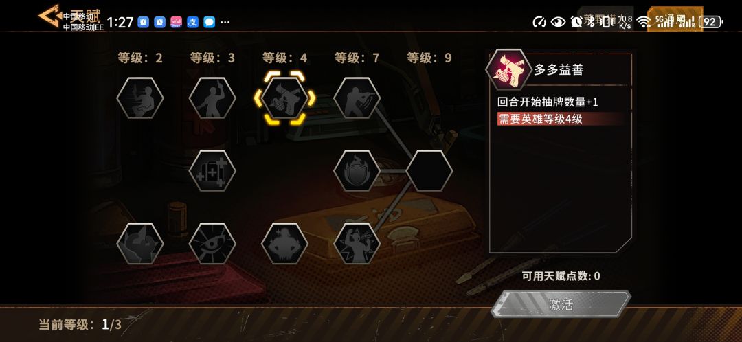 三级点游刃有余,让米拉琴可以免费释放技能。此时第1个等级上限达到,需要战胜第1个boss之后才能够继续开放后面的等级