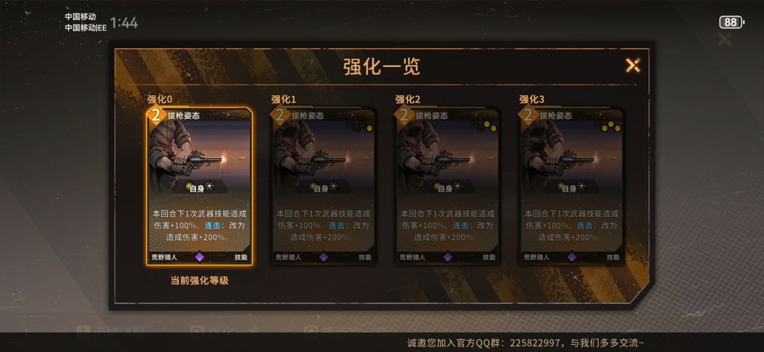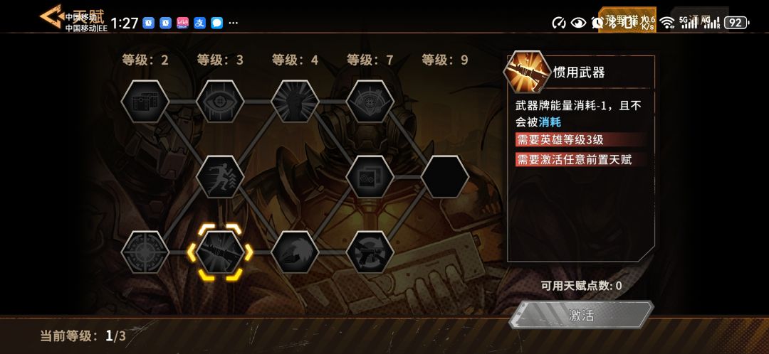 第5集的时候选择惯用武器。之所以现在才点,是因为此时你已经进入了第二阶段,而在第1阶段中,武器基本都够用,不太可能一场战斗下来敌人还没死完武器就用完了。如果你不点这个技能,那么你的武器是一次性消耗品,耐久耗尽或者是被替换后就会在当场战斗中被移出牌堆,直到下场战斗才能被使用。有了这个技能后,你的武器也会在使用,会被替换后正常进入弃牌堆了。