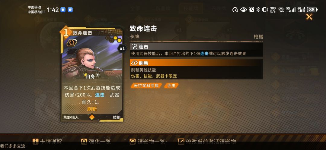 专属卡“致命连击”是你解锁这个英雄的前提,所以默认每人都有,是米拉琴高爆发和长续航的根基。