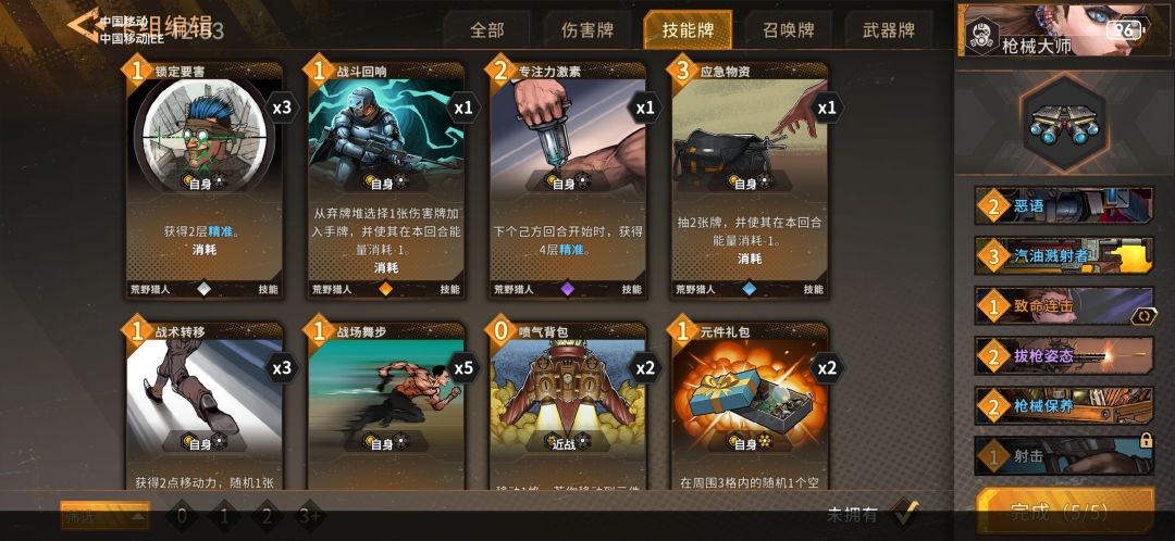 此后此后的运营重点是删掉牌库中初始的射击和格挡牌,尽可能的把核心卡牌致命射击升到满级。有条件的可以给拔枪姿态(腰射)镶嵌一个巧手部件,这样抽到时有概率能量消耗会降低为一点或零点。