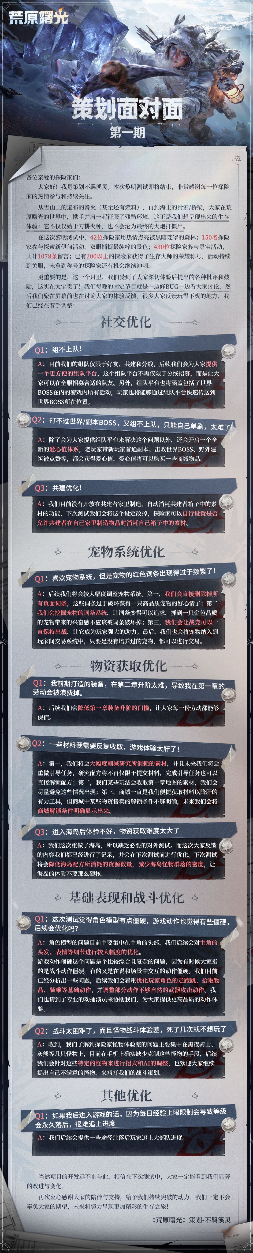 以及就本次测试期间探险家们关心的几个问题进行了回答,一起来看看本期内容吧!