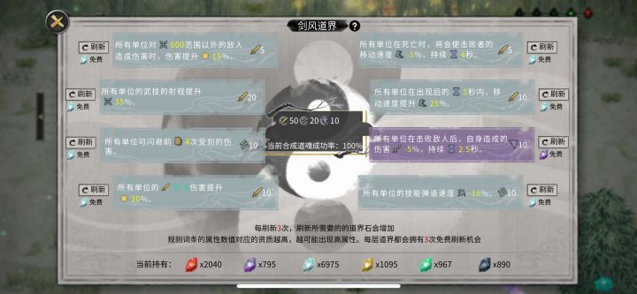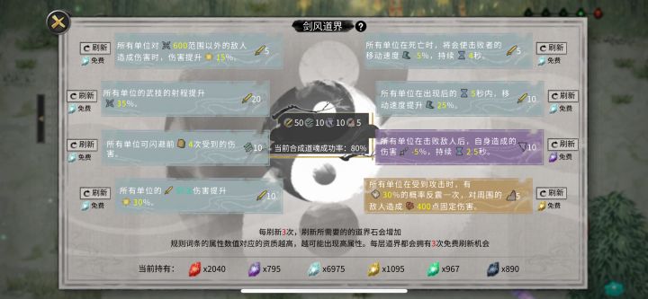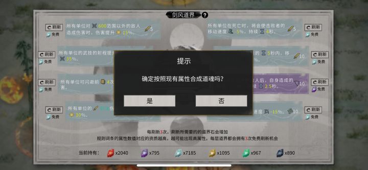 然后就可以去风剑道场开打。每打完一个图进入下一个图的时候会出现一个属性界面,每幅图出两个,总共会出现八个。这里需要注意的是每个属性的右上角都有一个小数字,同一个属性数值之和越大优先级越高。我想要剑属性的道魂那么我就要保证剑属性的数值是最多的。