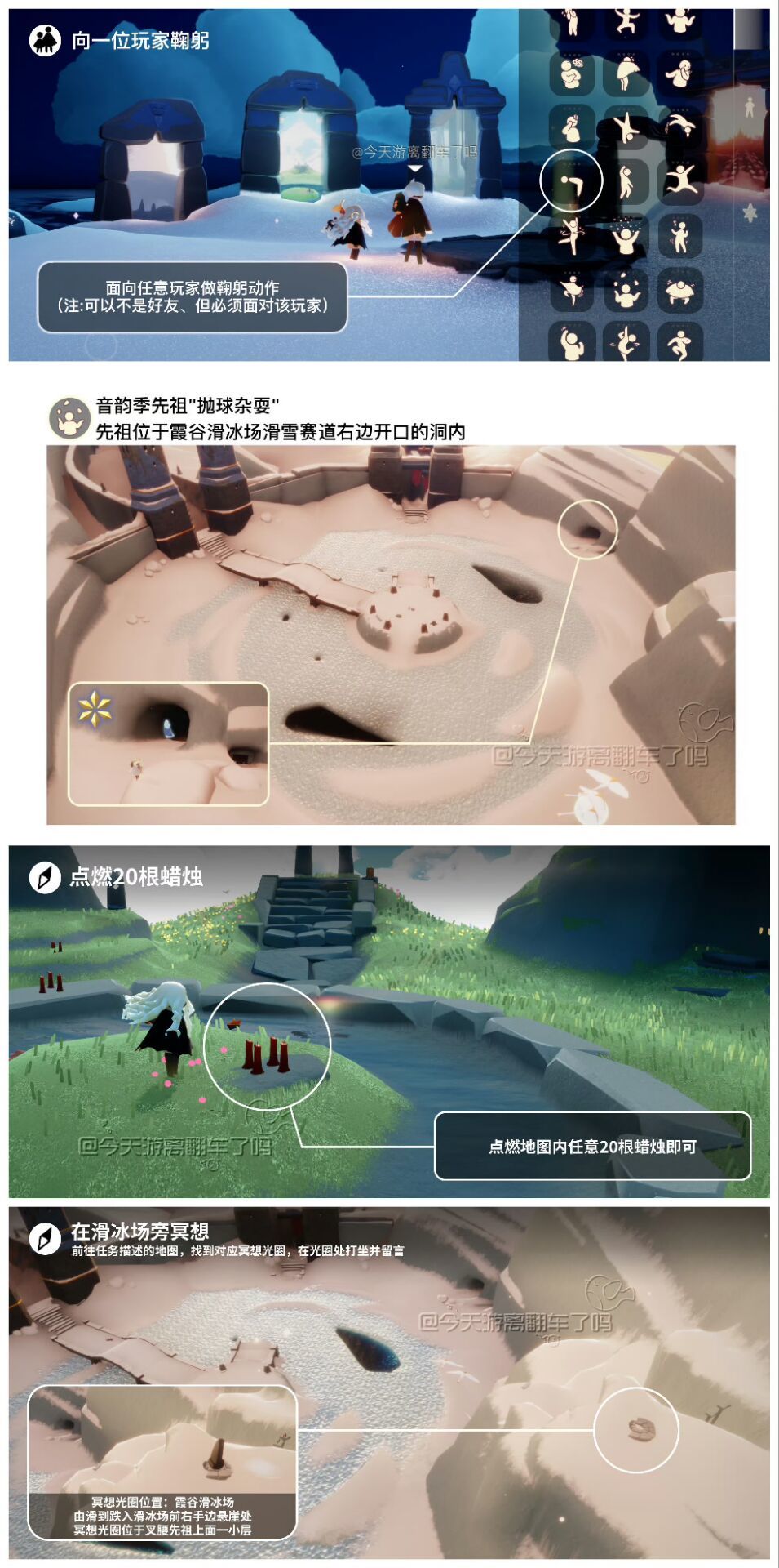《光遇》游戏中每天的每日任务及大蜡烛的位置都不相同,玩家完成每日任务及收集大蜡烛都可以得到丰厚的兑换奖励,奖励可以用于兑换各种动作及道具,不过很多小伙伴不知道每日任务怎么做,又懒得自己去找大蜡烛的位置,我们汇总了每日任务的完成攻略以及蜡烛位置,一起来看看吧!