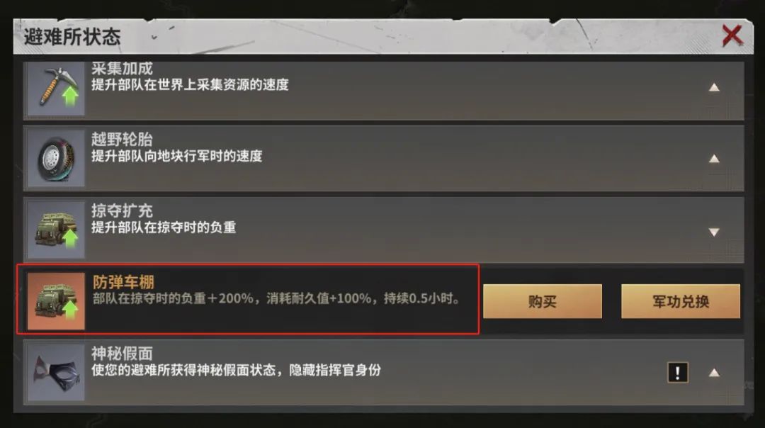 另外,使用道具【防弹车棚】可以极大提升掠夺时的负重,大大提升效率。
